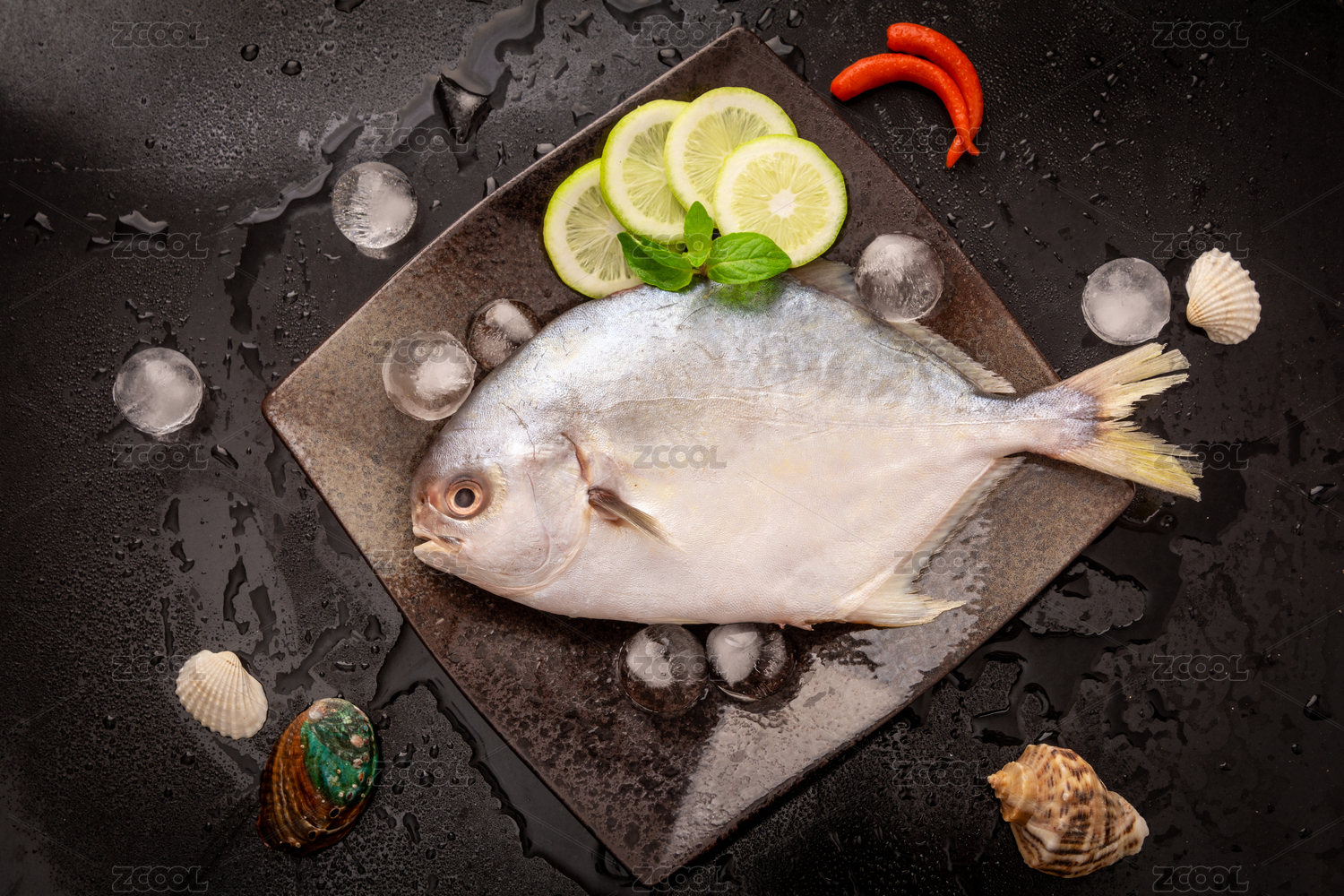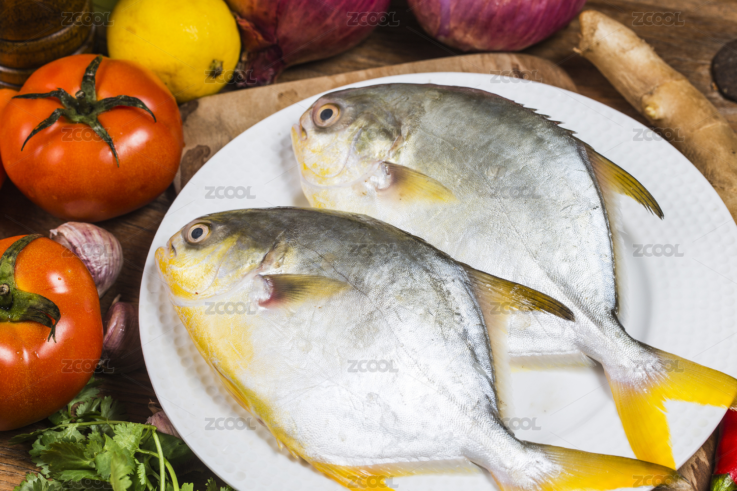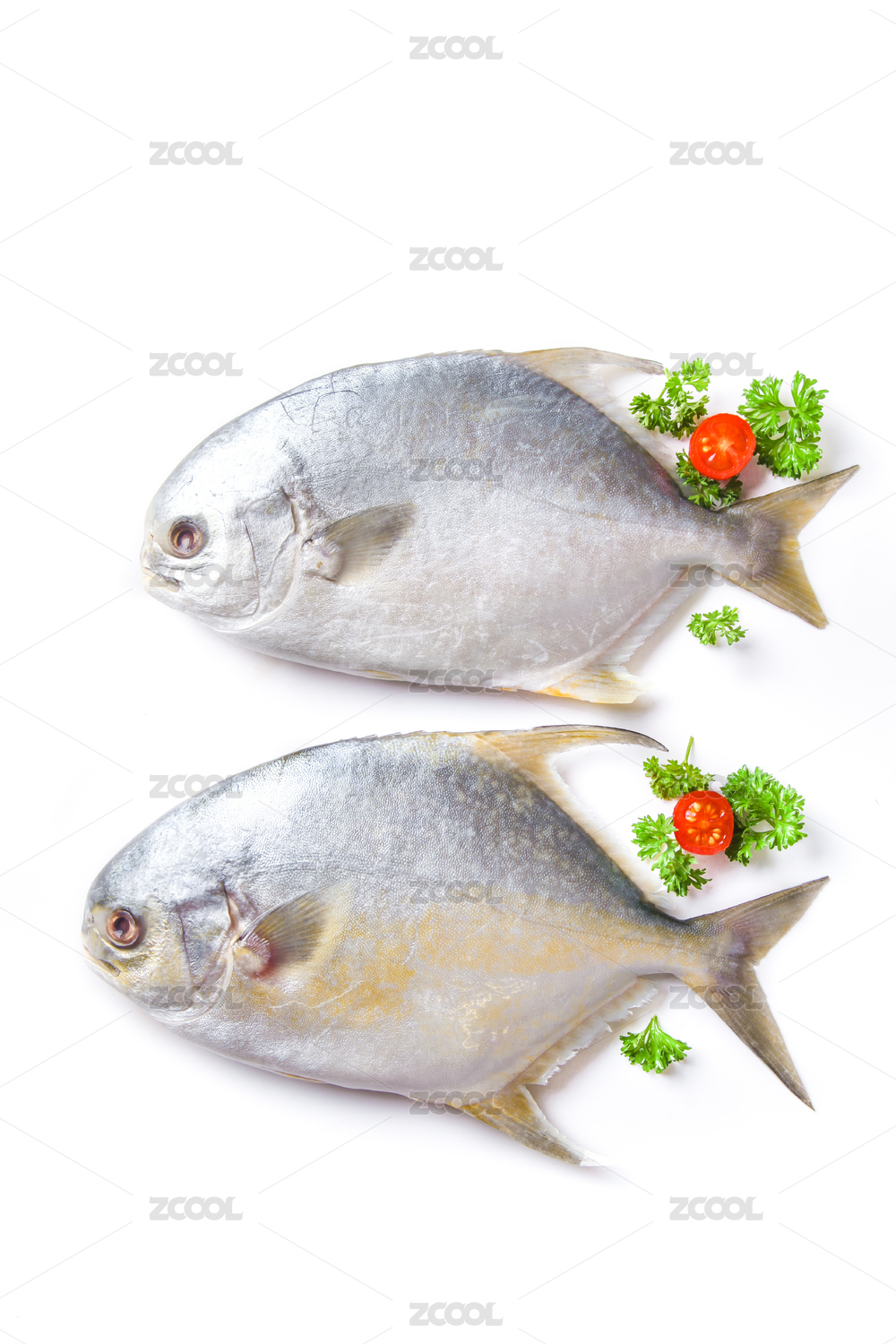 白背景上菜碟里一条新鲜海鱼金鲳鱼