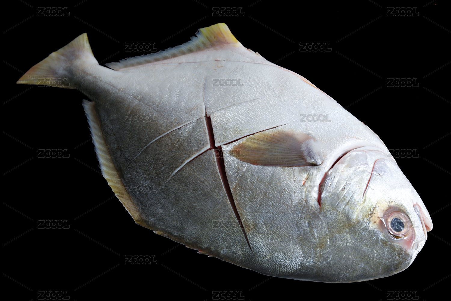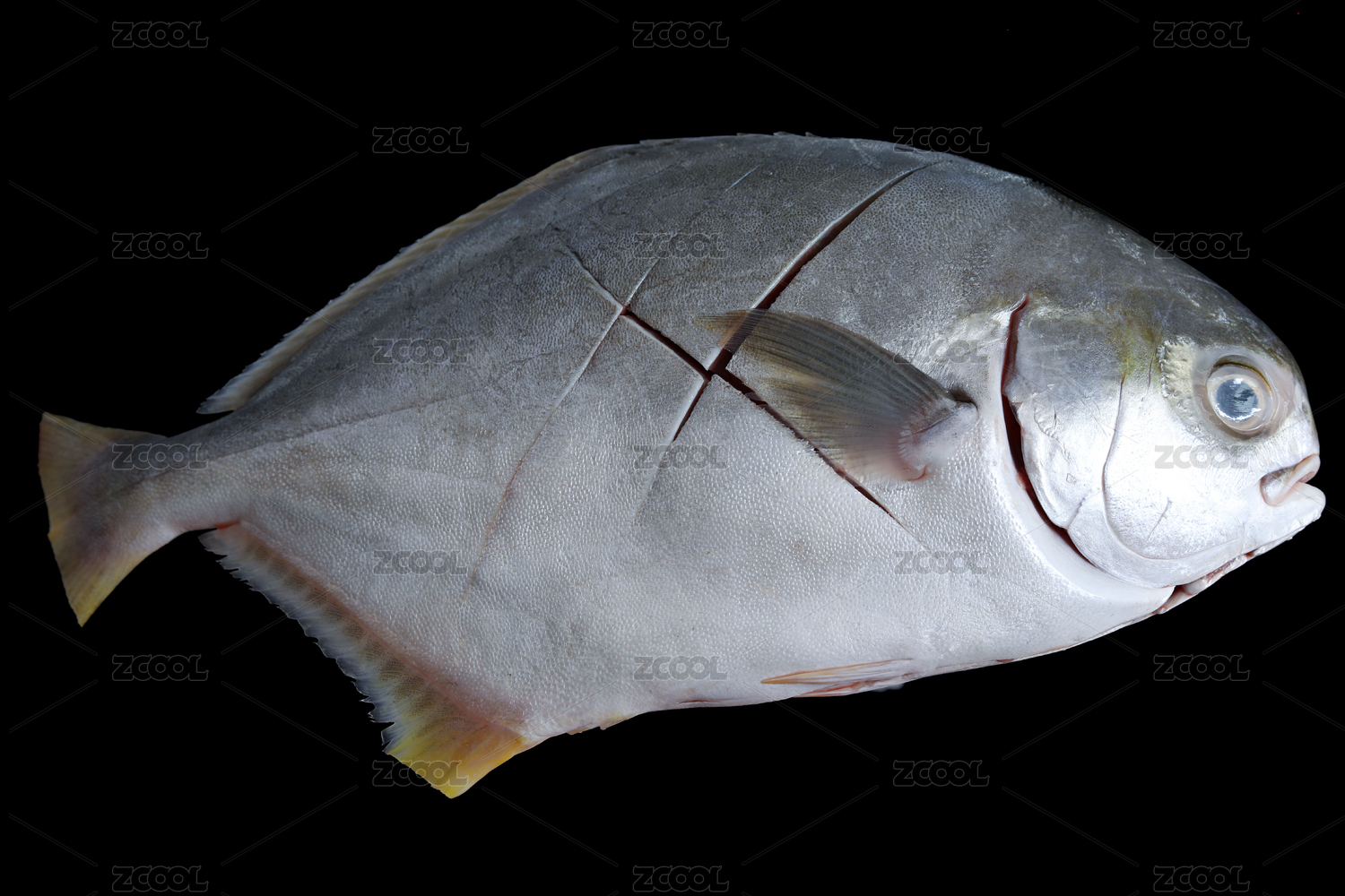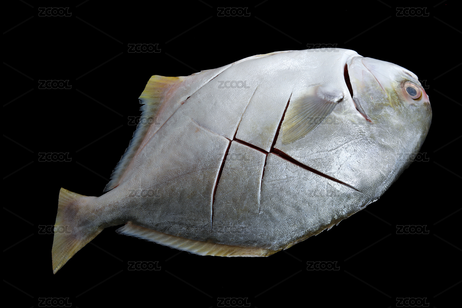 黑色背景上的一条新鲜食材海鲜金鲳鱼的特写