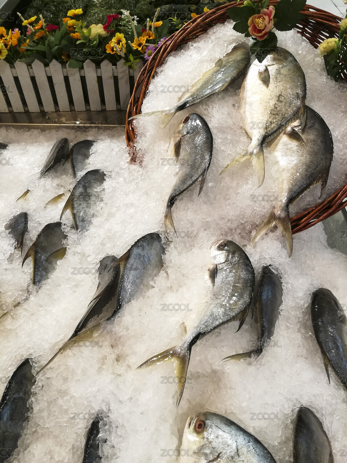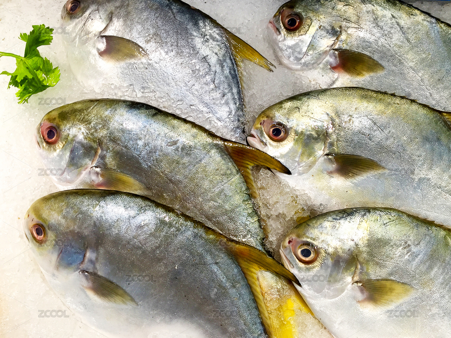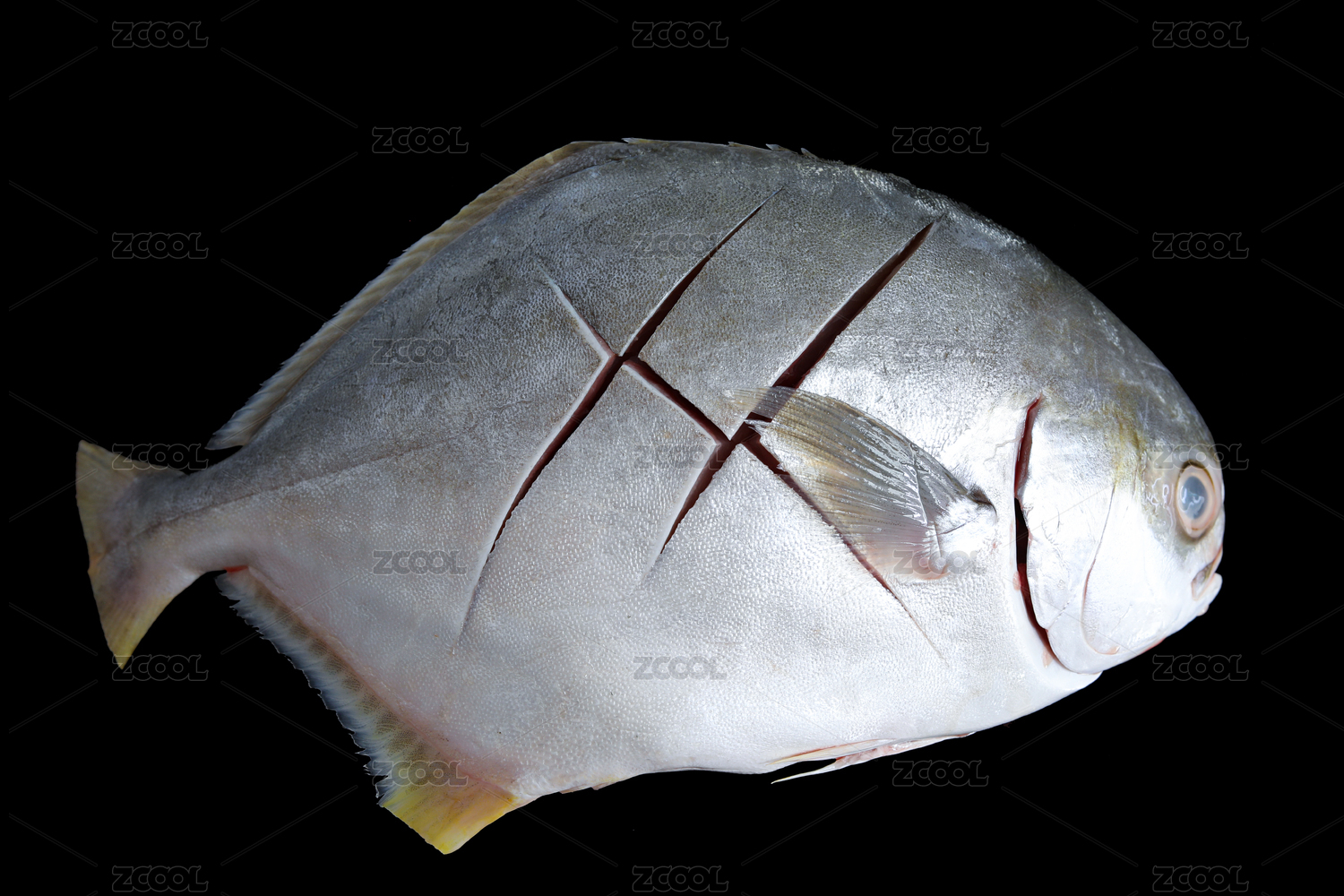 黑色背景上的一条新鲜食材海鲜金鲳鱼的特写