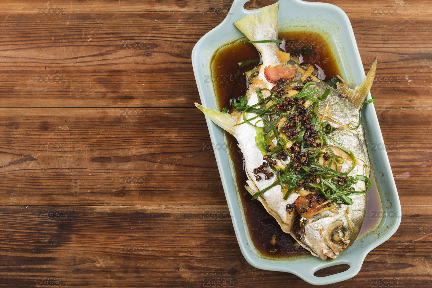 厨房台面上一道烹饪好的中国菜清蒸金鲳鱼