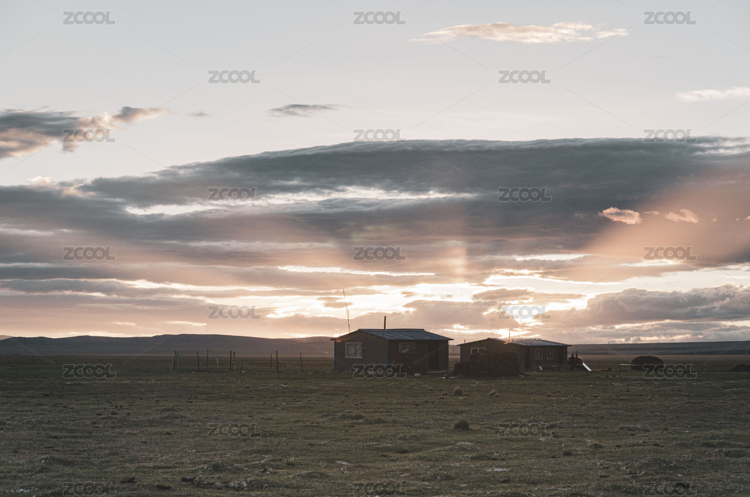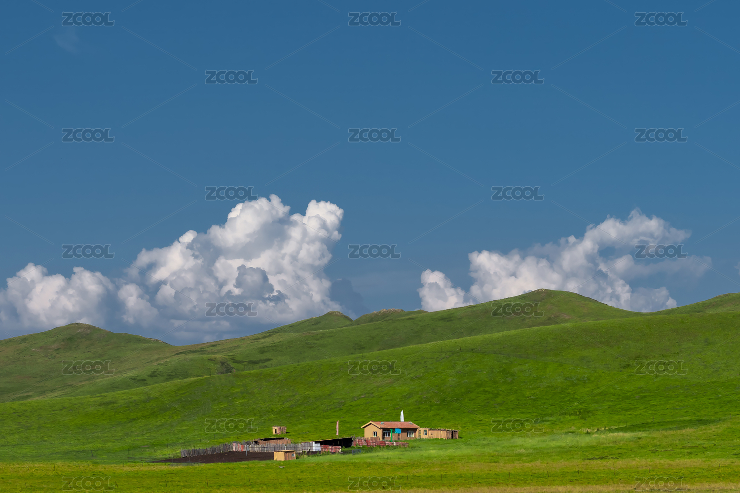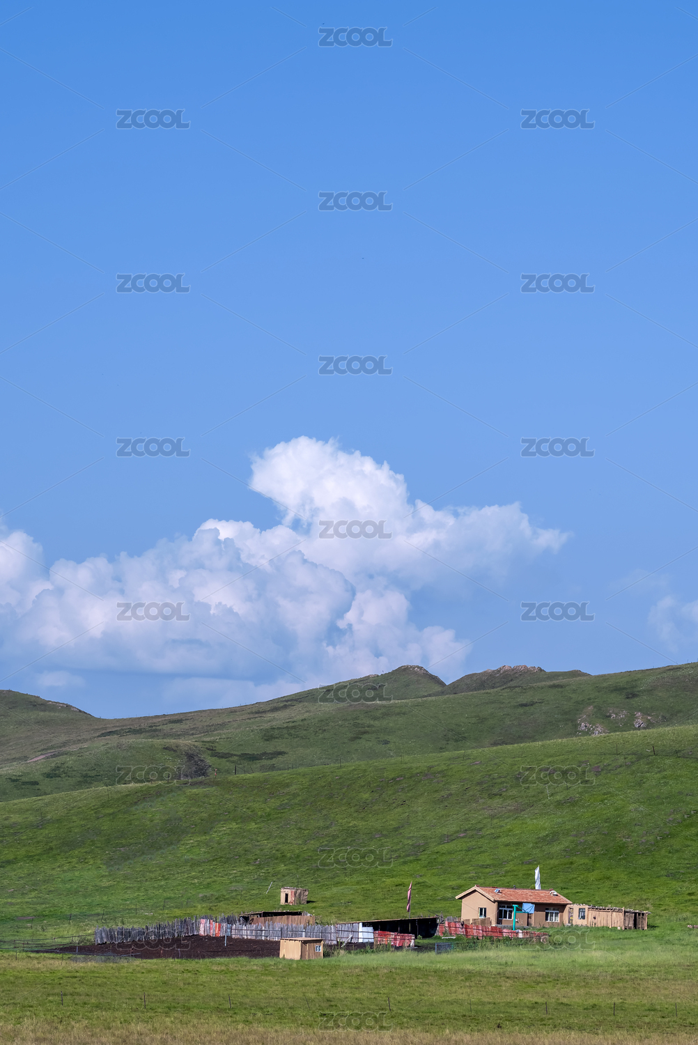 蓝天白云下草原牧民房子风景