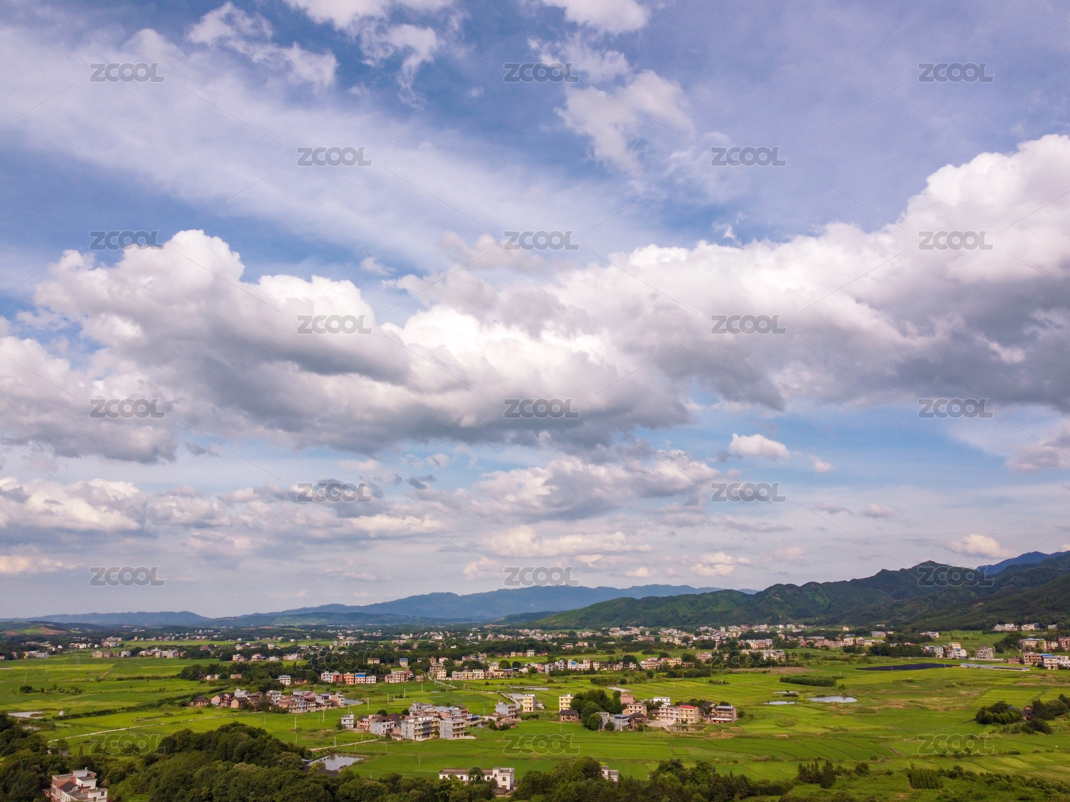 航拍蓝天白云乡村田园风光