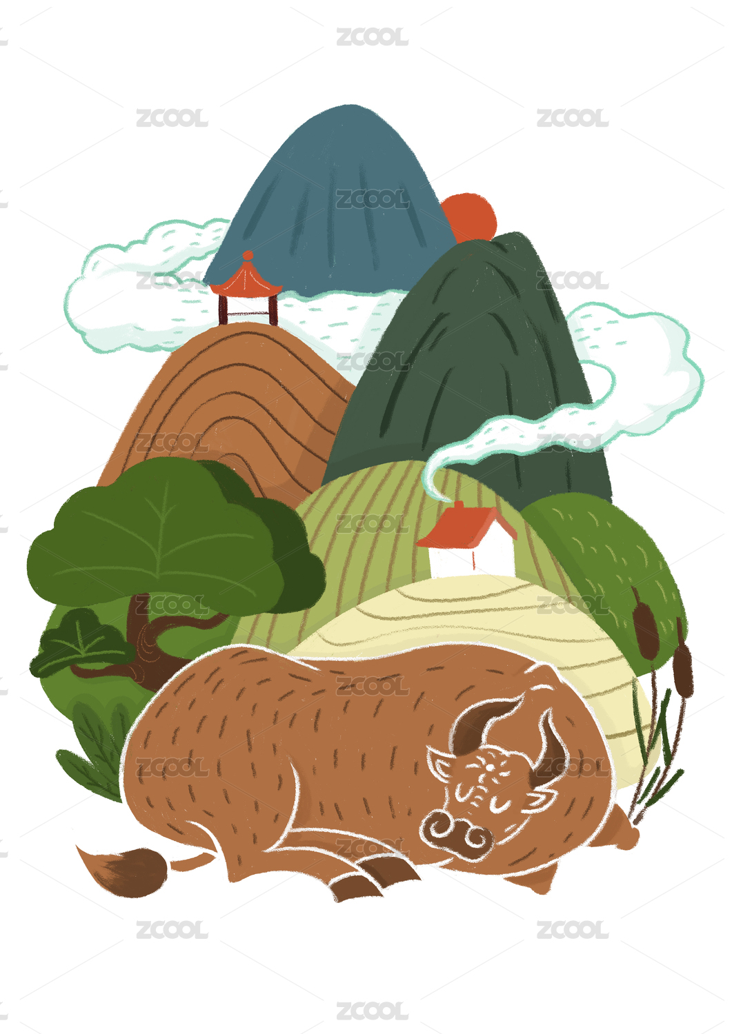 牛与家园青山绿水保护环境插画