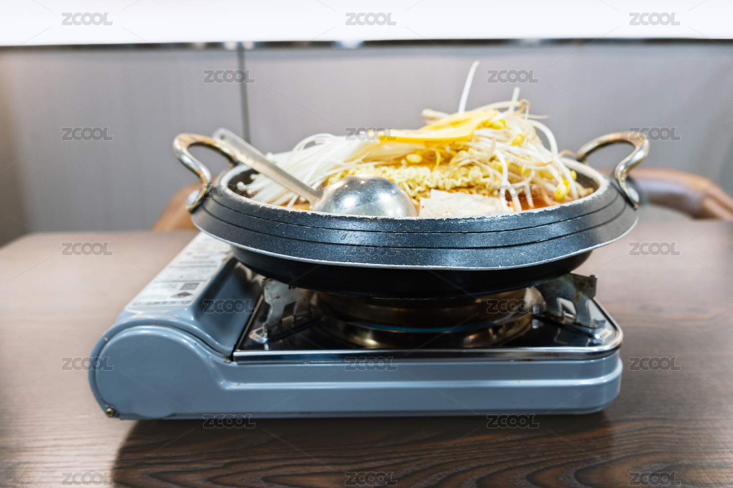 热气腾腾的韩式部队火锅,卡式炉燃烧着火焰