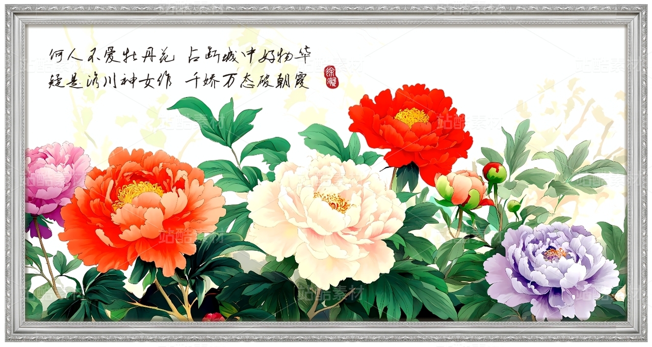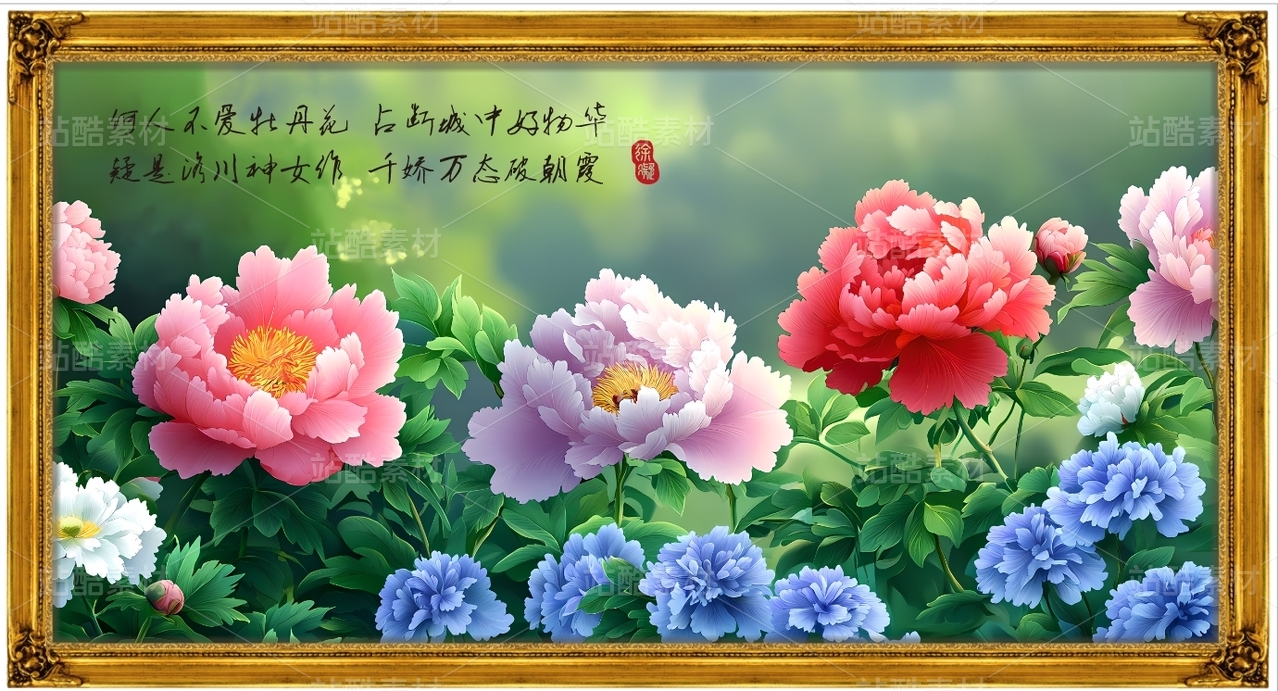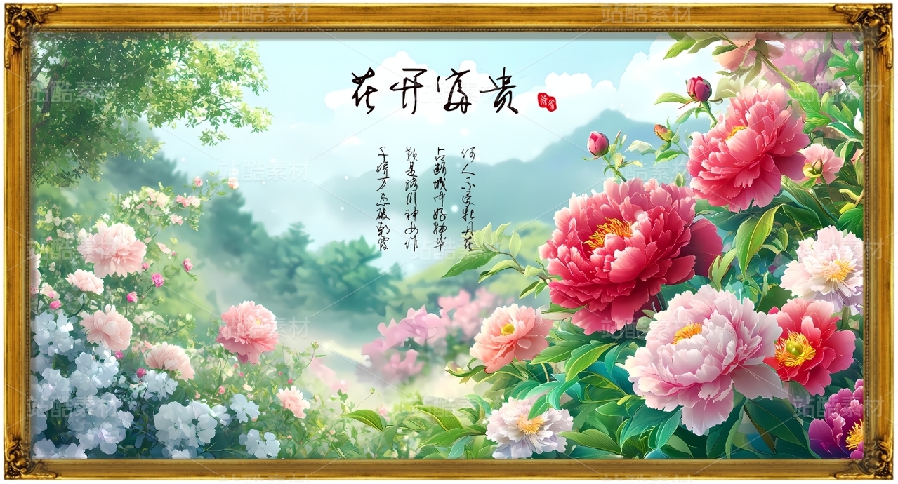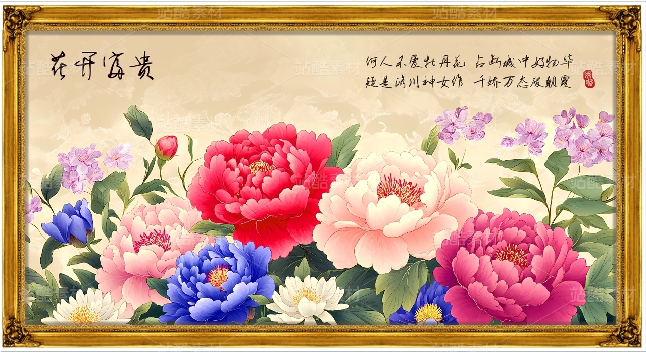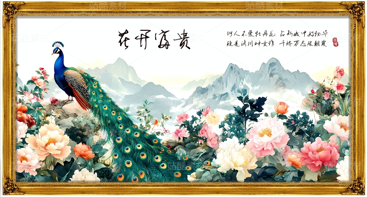 花开富贵牡丹花孔雀中式国画画框装饰素材壁画玄关挂画