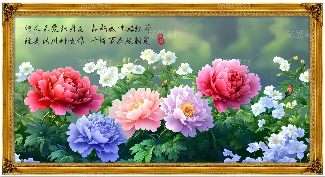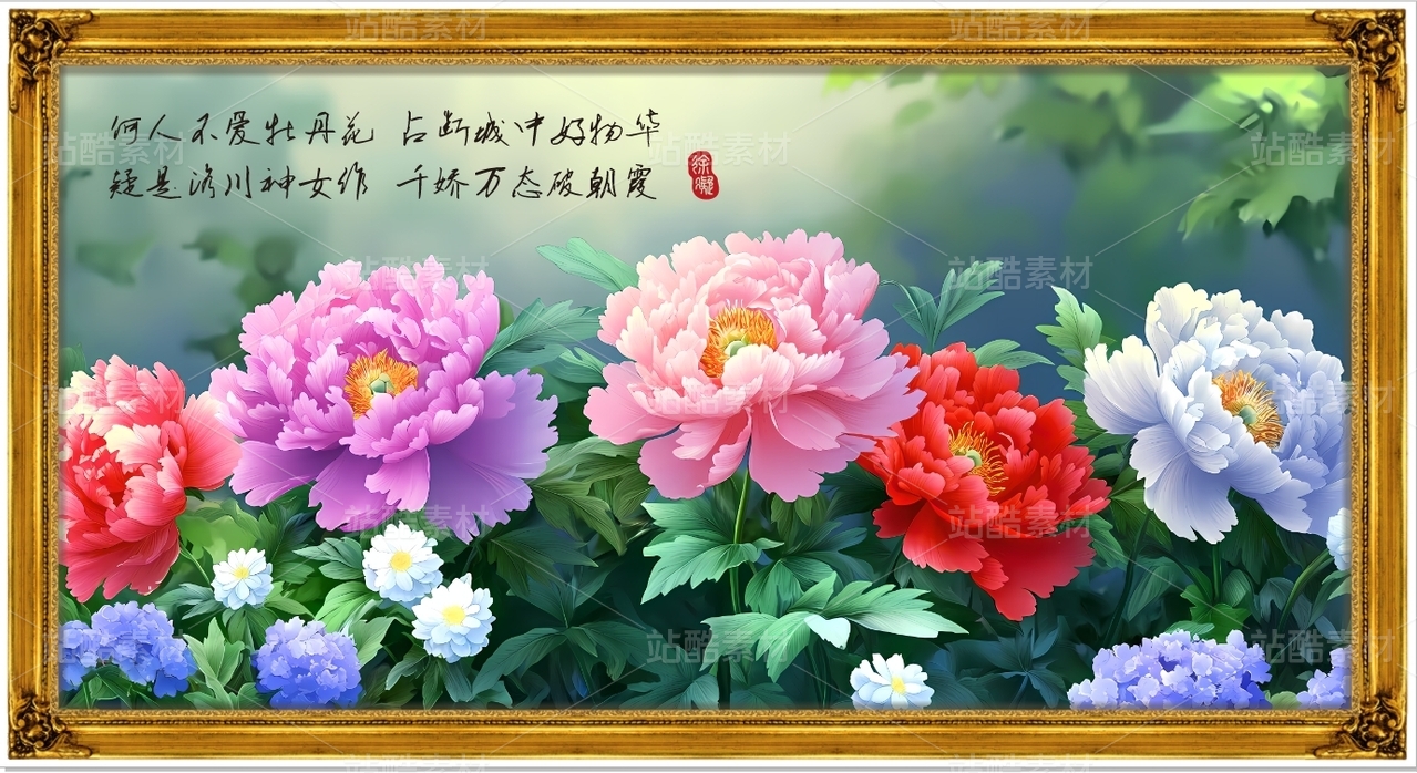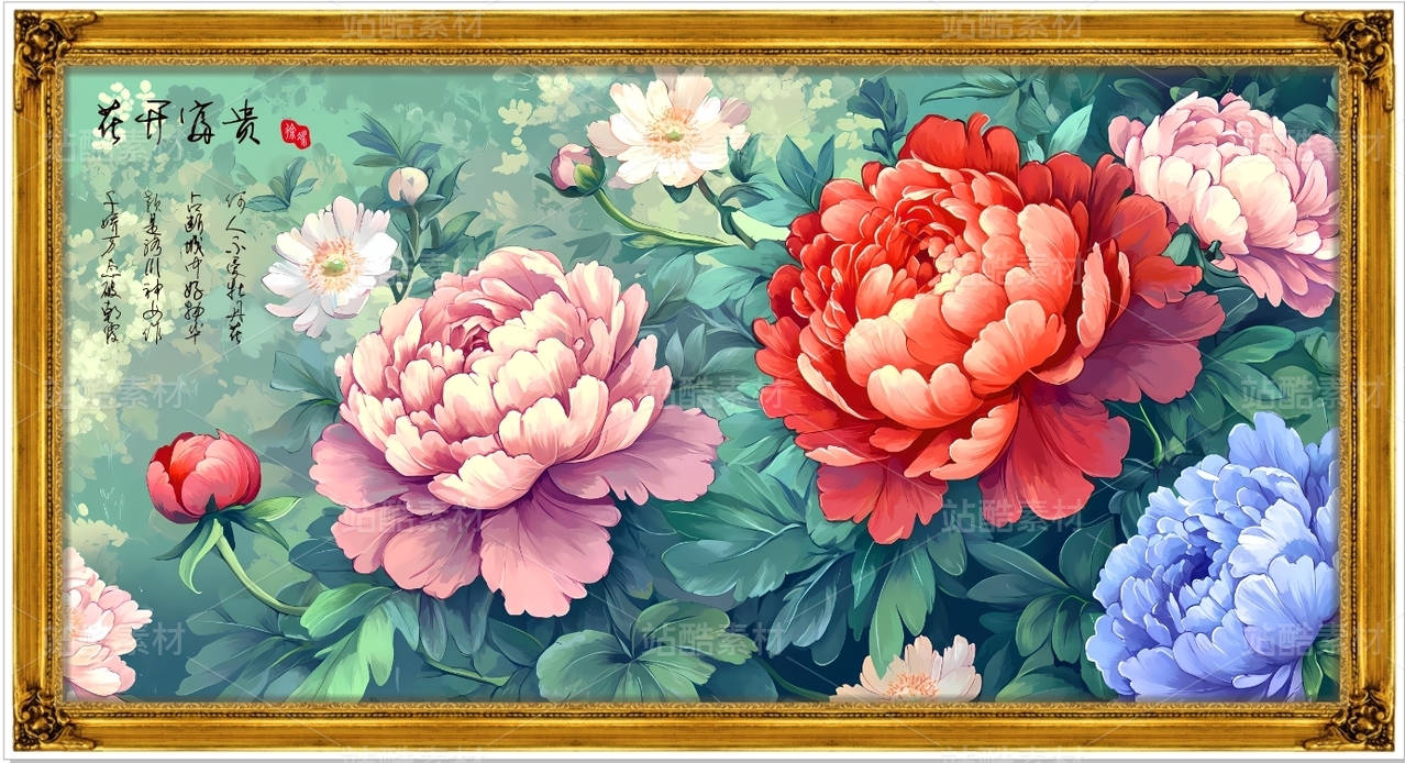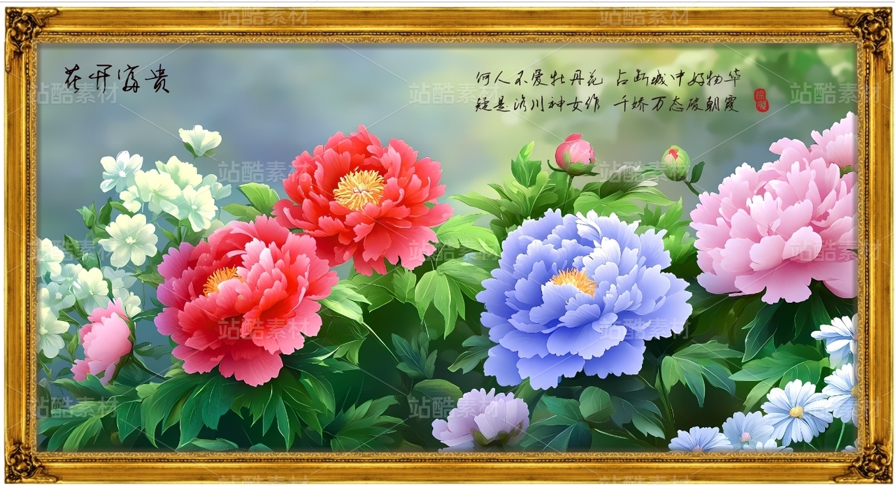 花开富贵牡丹花孔雀中式国画画框装饰素材客厅壁画挂画