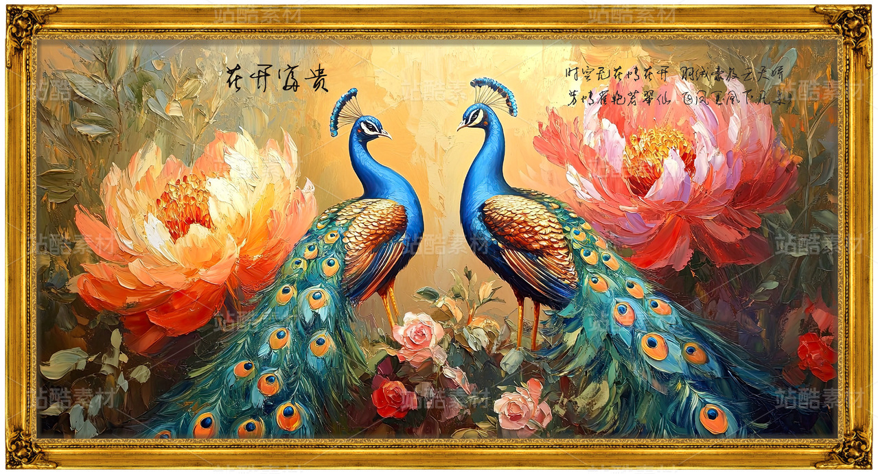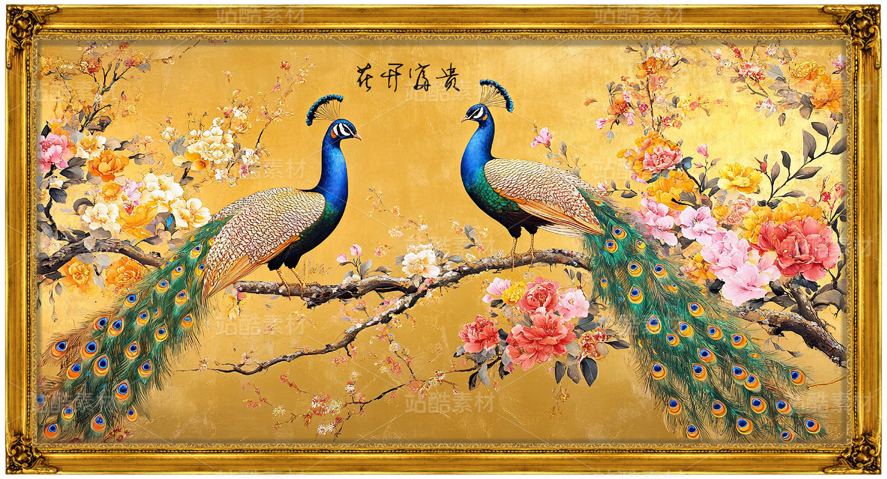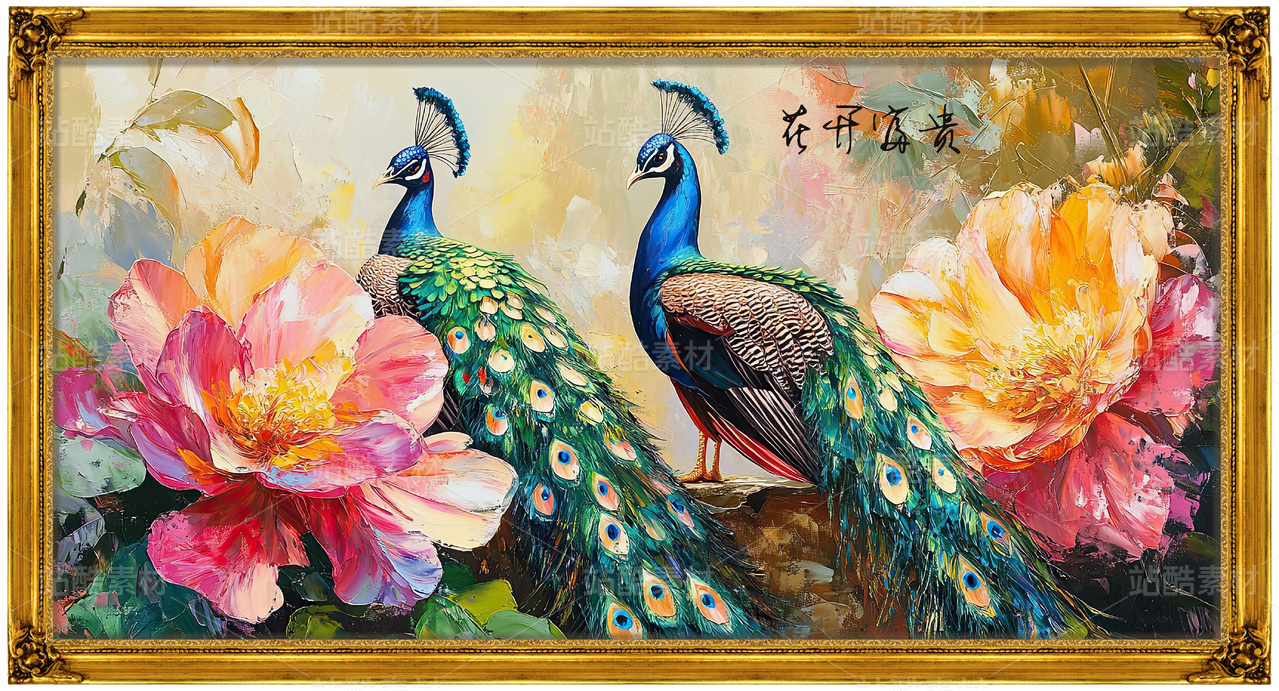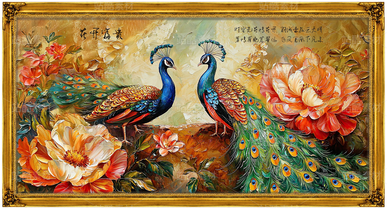 花开富贵牡丹花孔雀中式国画画框装饰素材客厅壁画挂画
