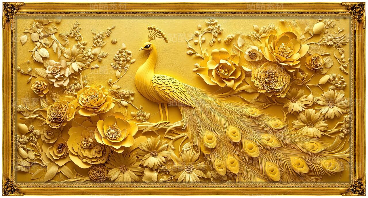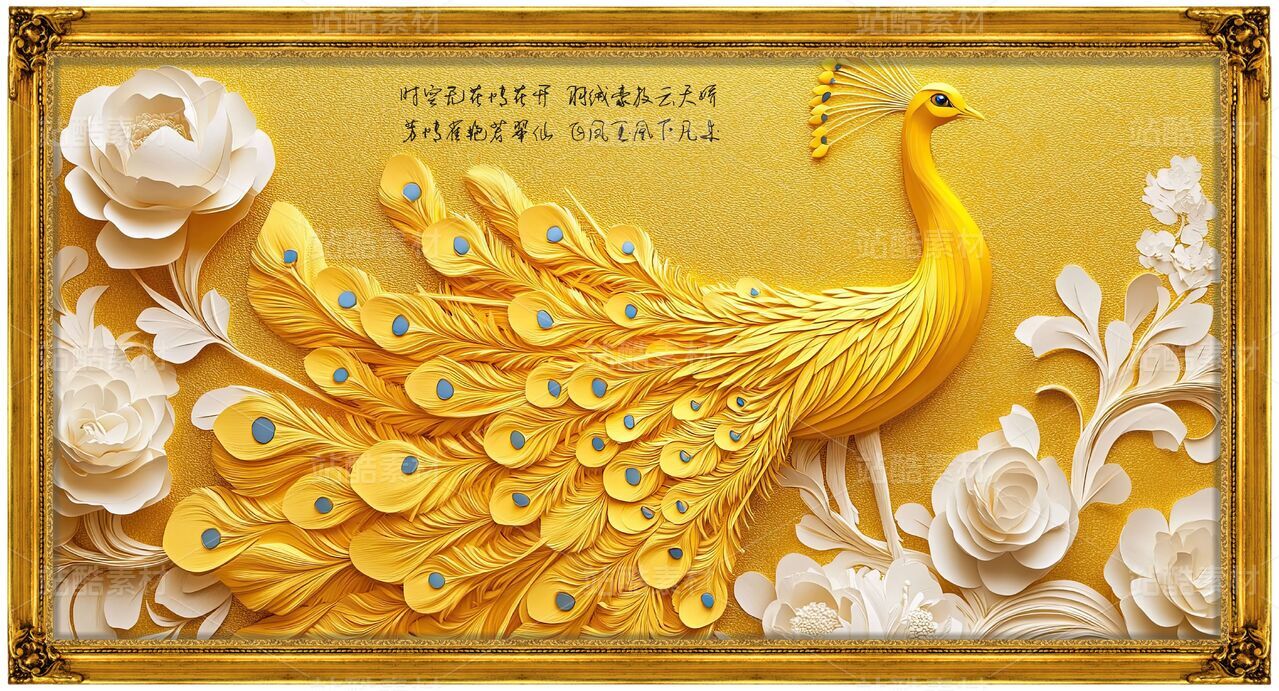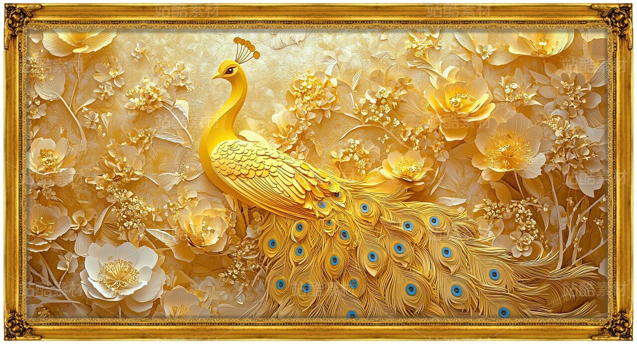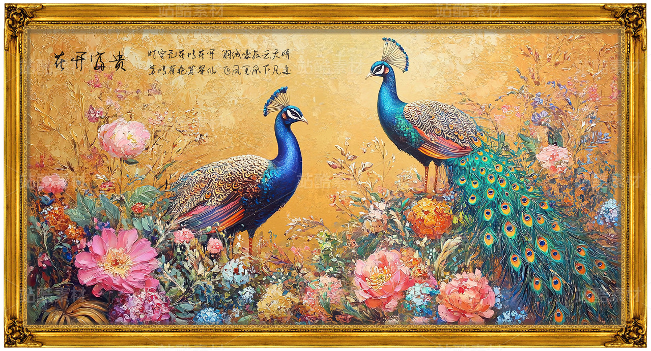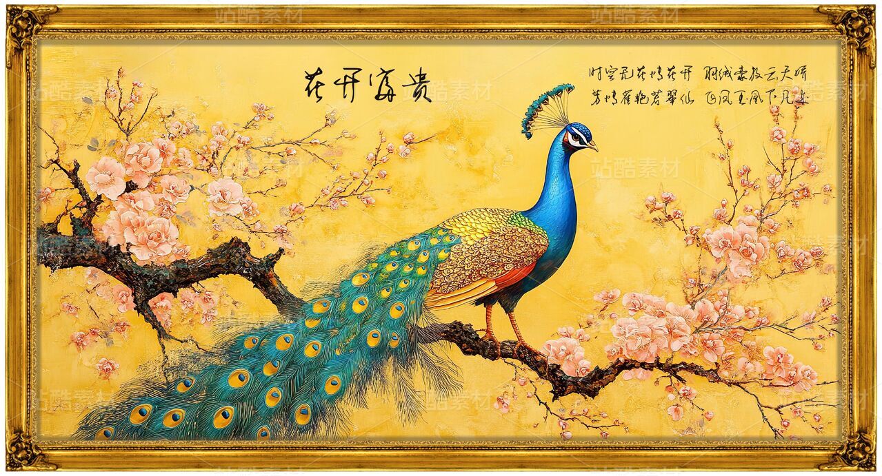 花开富贵牡丹花孔雀中式国画画框装饰素材客厅壁画挂画