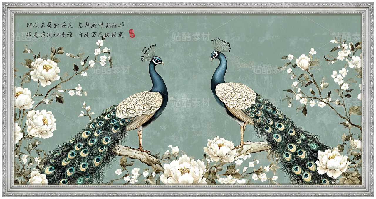 花开富贵牡丹花白色孔雀中式国画画框装饰素材客厅壁画