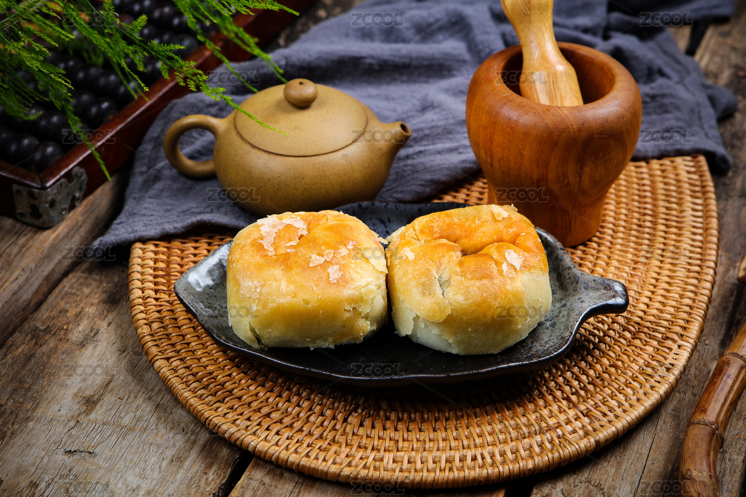 桌面上茶壶前的黑色长碟内的酥皮糕点