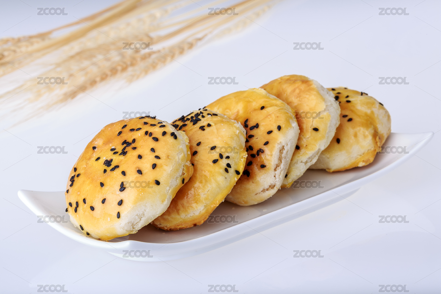 白色背景上麦穗前长碟里的烘焙酥皮糕点