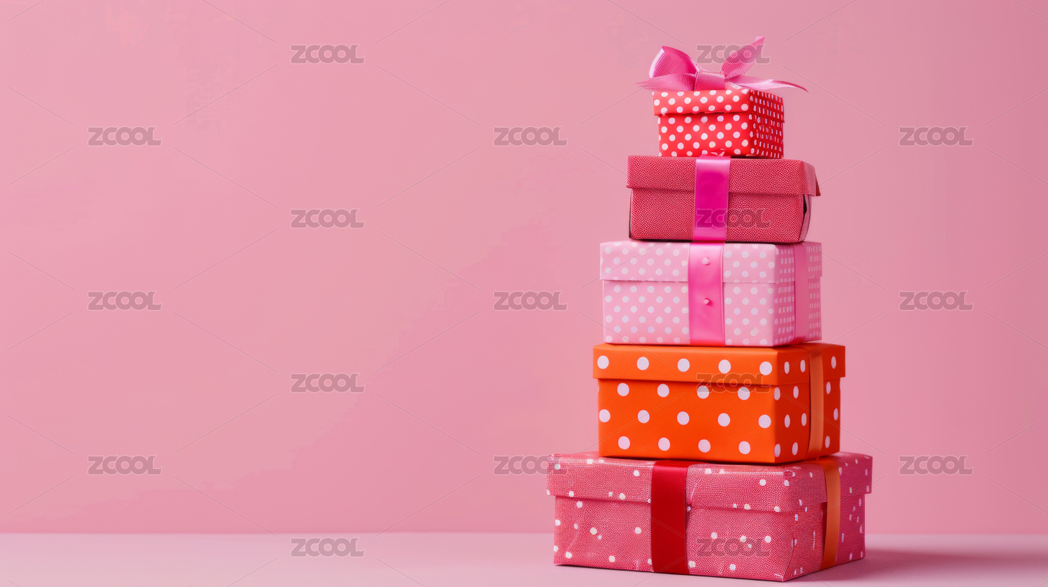 干净背景上堆砌的红色和粉色波点礼物盒