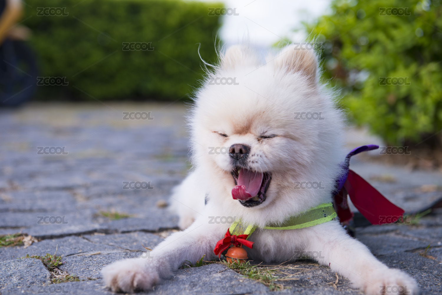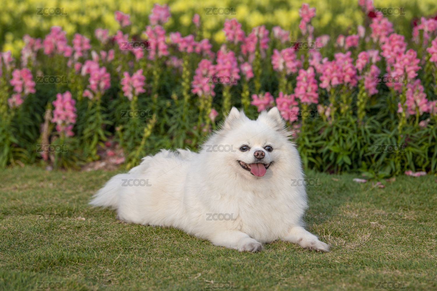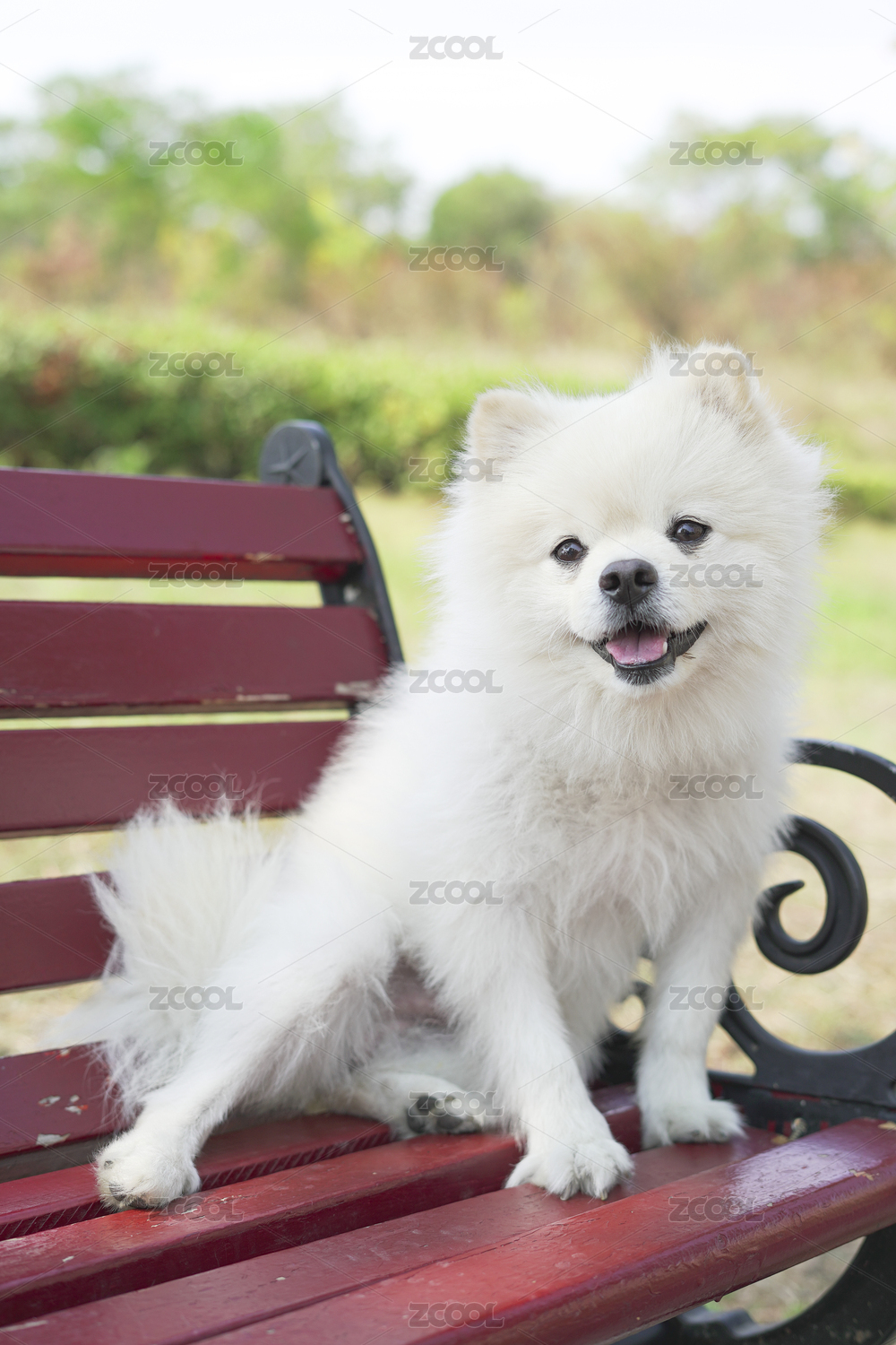 坐在箱子边吐舌头的博美犬正面 纯色背景