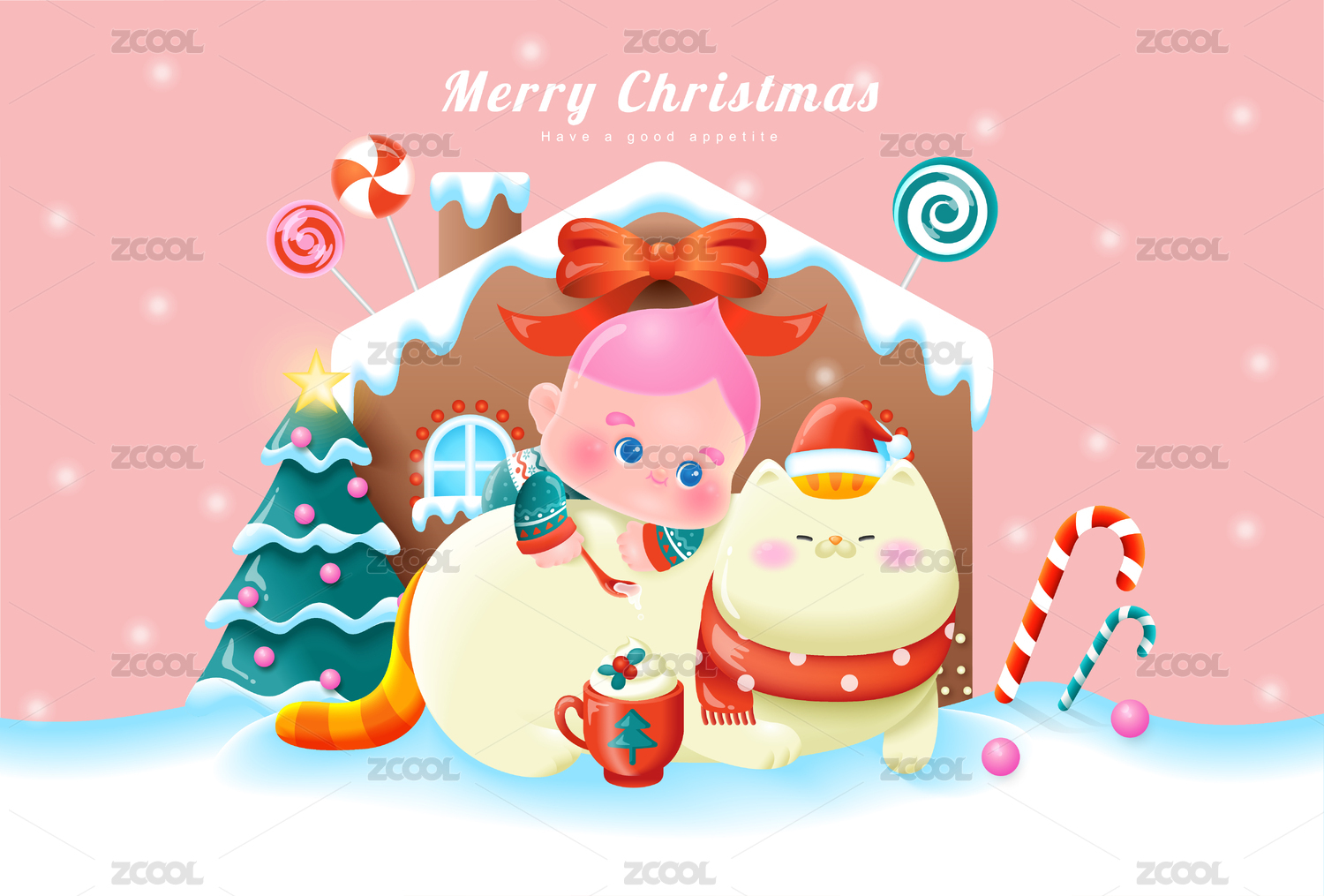 圣诞节糖果屋前的小孩和猫