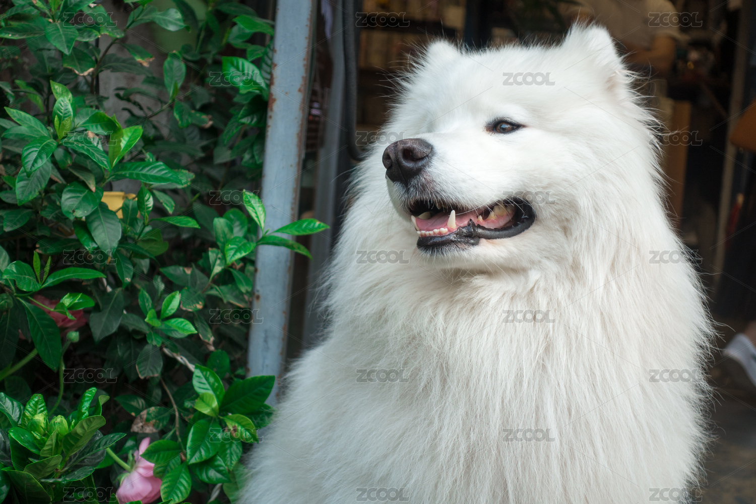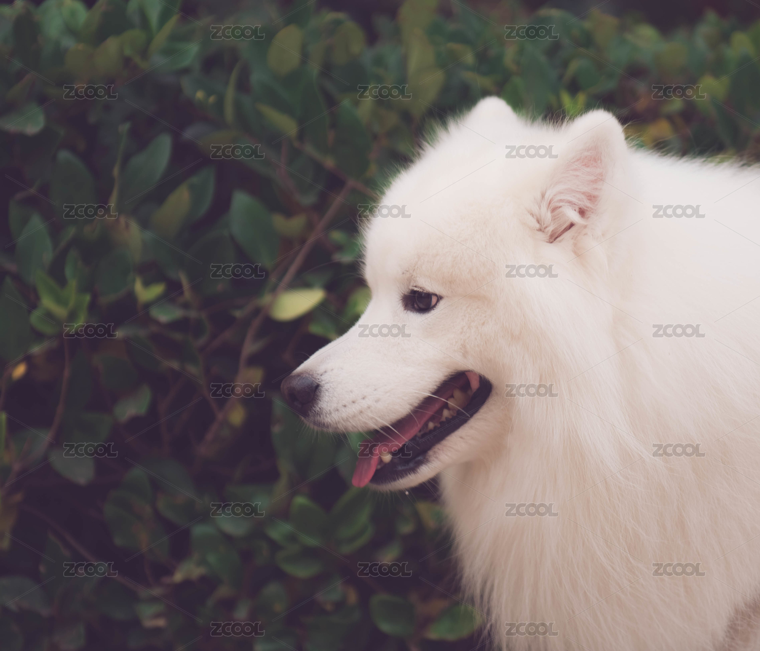 夜幕降临,一只白色的萨摩耶狗狗坐在公园长椅上