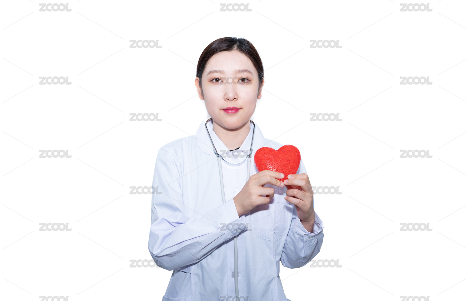 一个亲近和蔼的美女护士医生穿着白大褂看着镜头微笑白衣天使拿着心形概念
