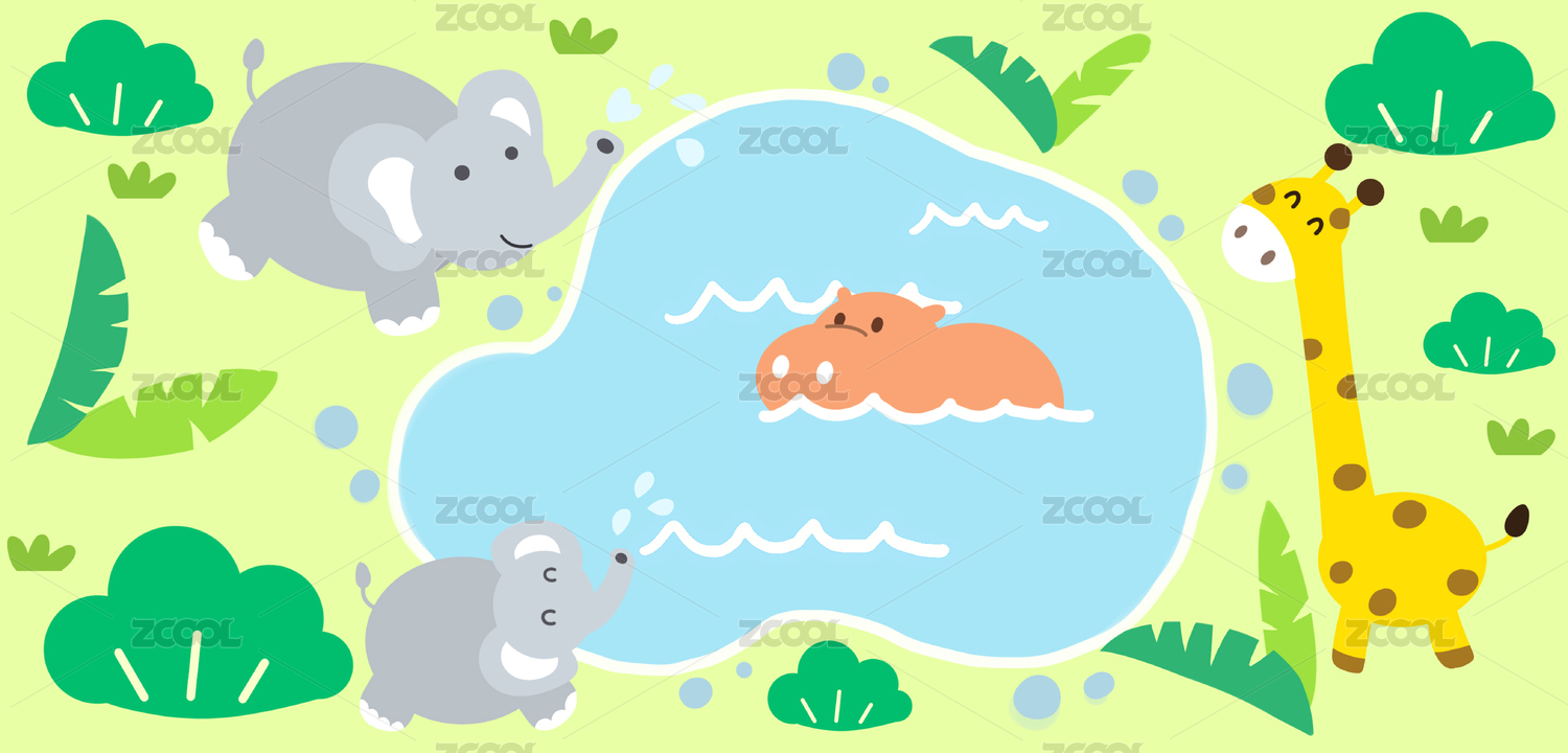 卡通丛林长颈鹿大象河马小湖元素插画