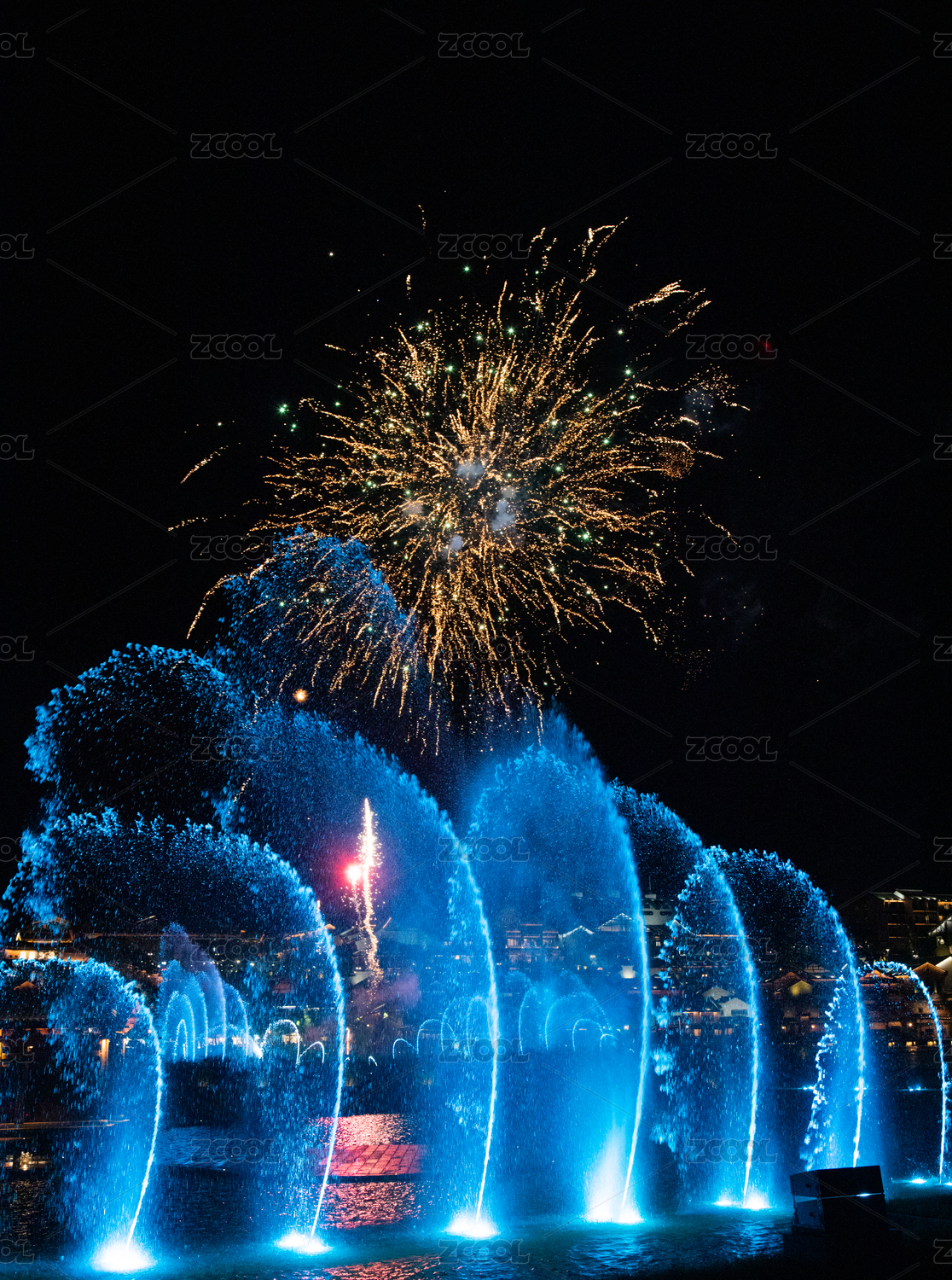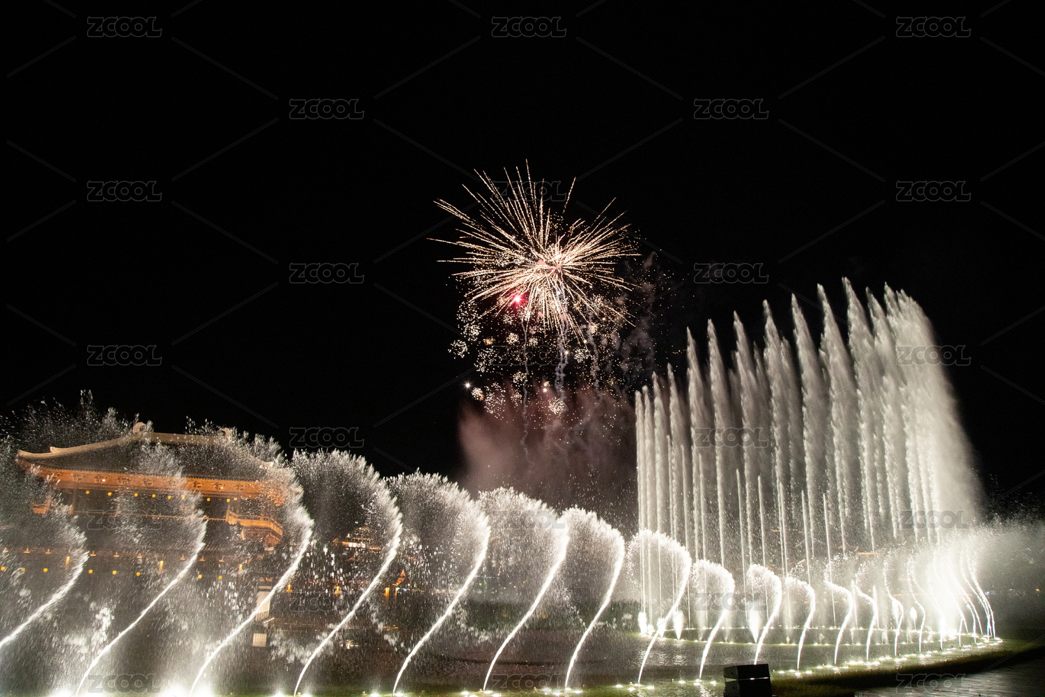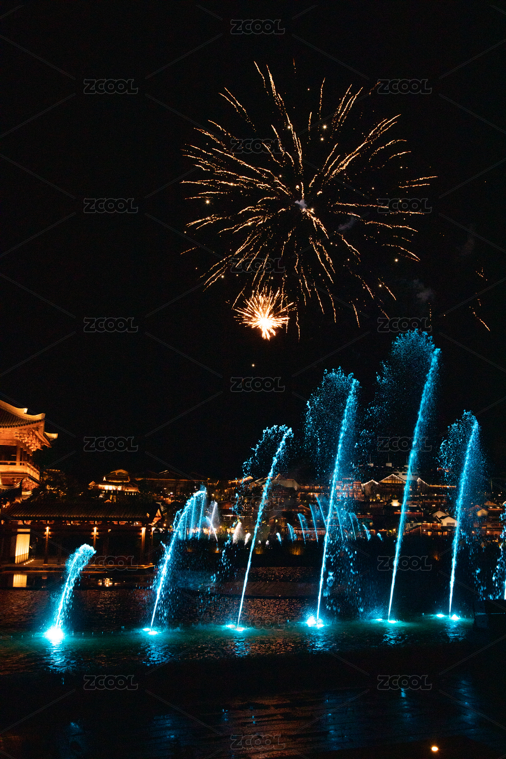 宜兴窑湖小镇夜空下的烟花与喷泉表演