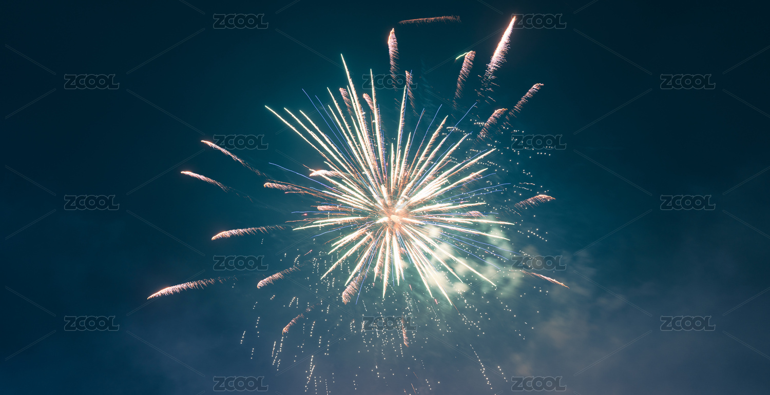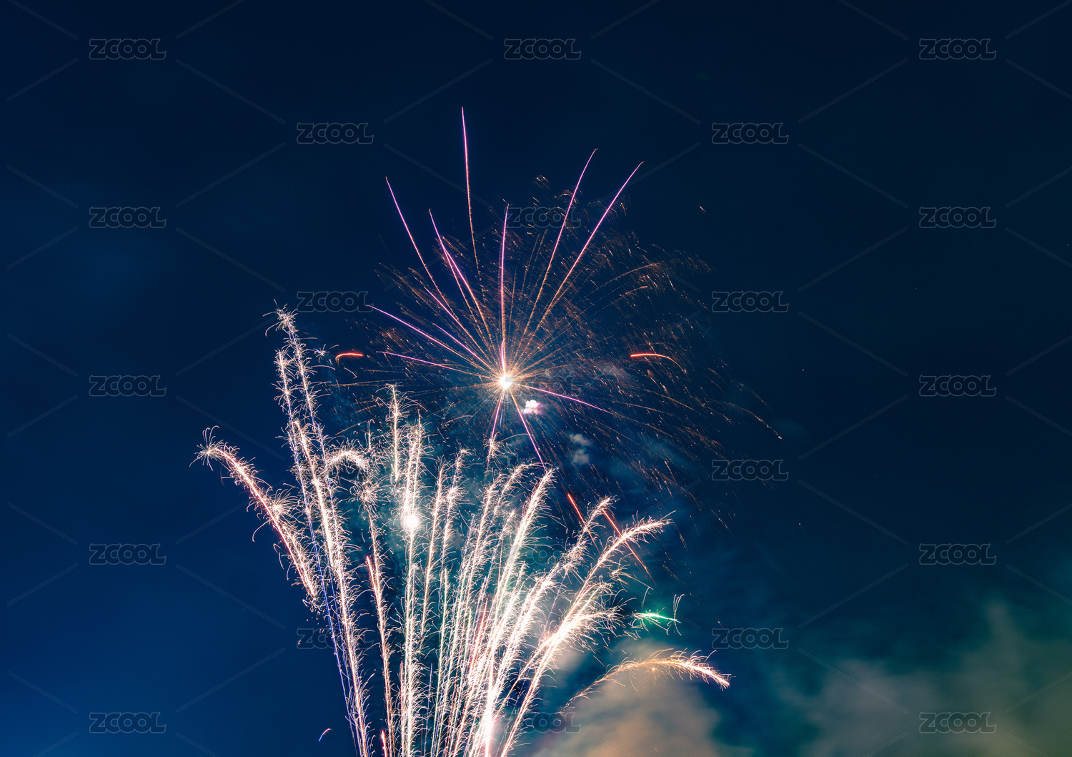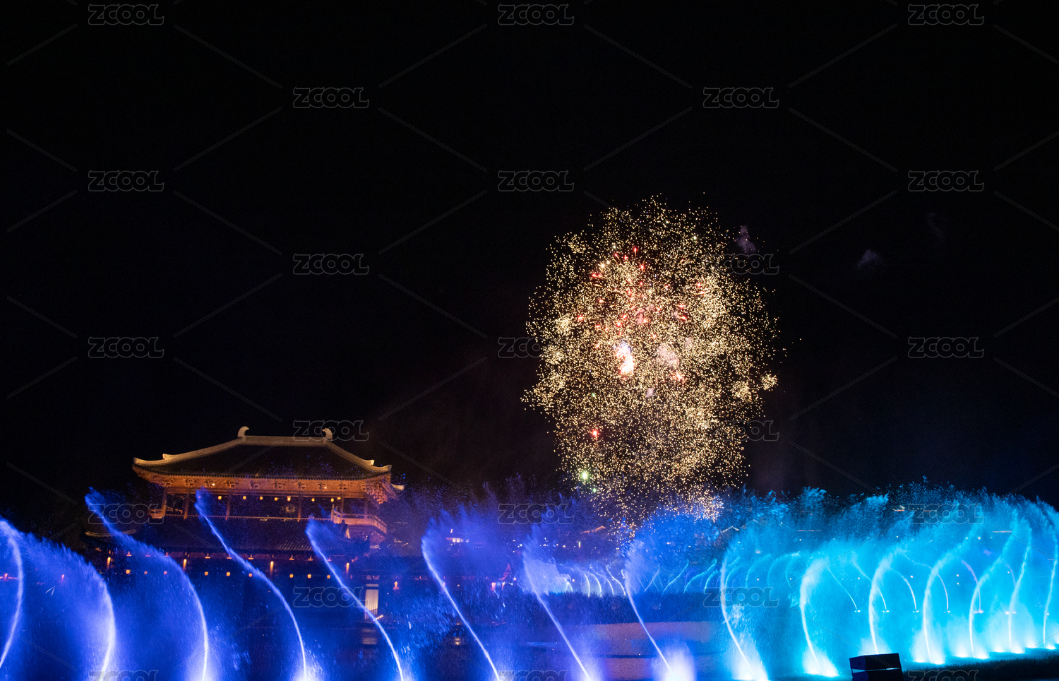 宜兴窑湖小镇夜空下的烟花与喷泉表演