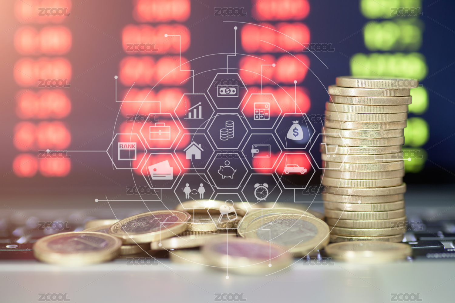 电脑屏幕显示着金融投资数据和键盘上一排美元硬币