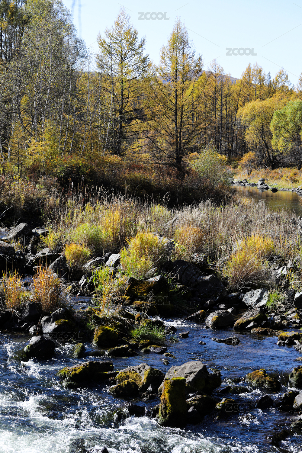 秋天阿尔山金黄色树木树叶和溪流的自然风景