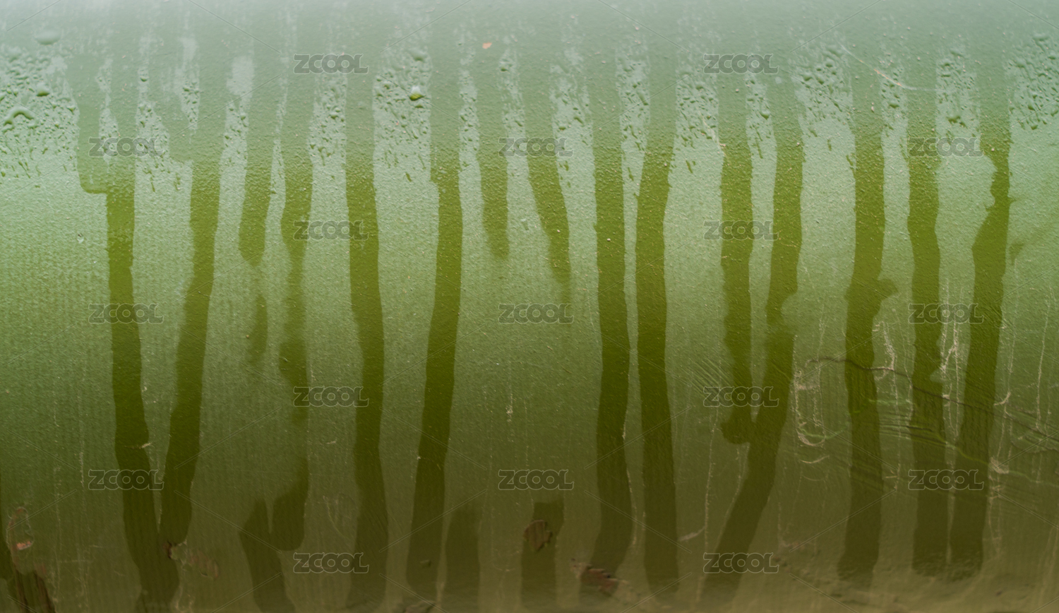 雨天绿色钢管上雨滴的流痕纹理特写