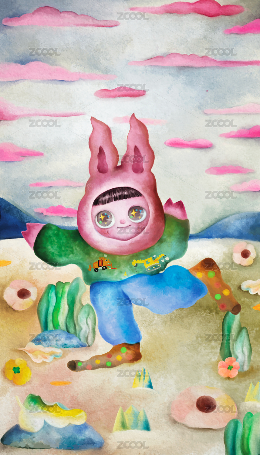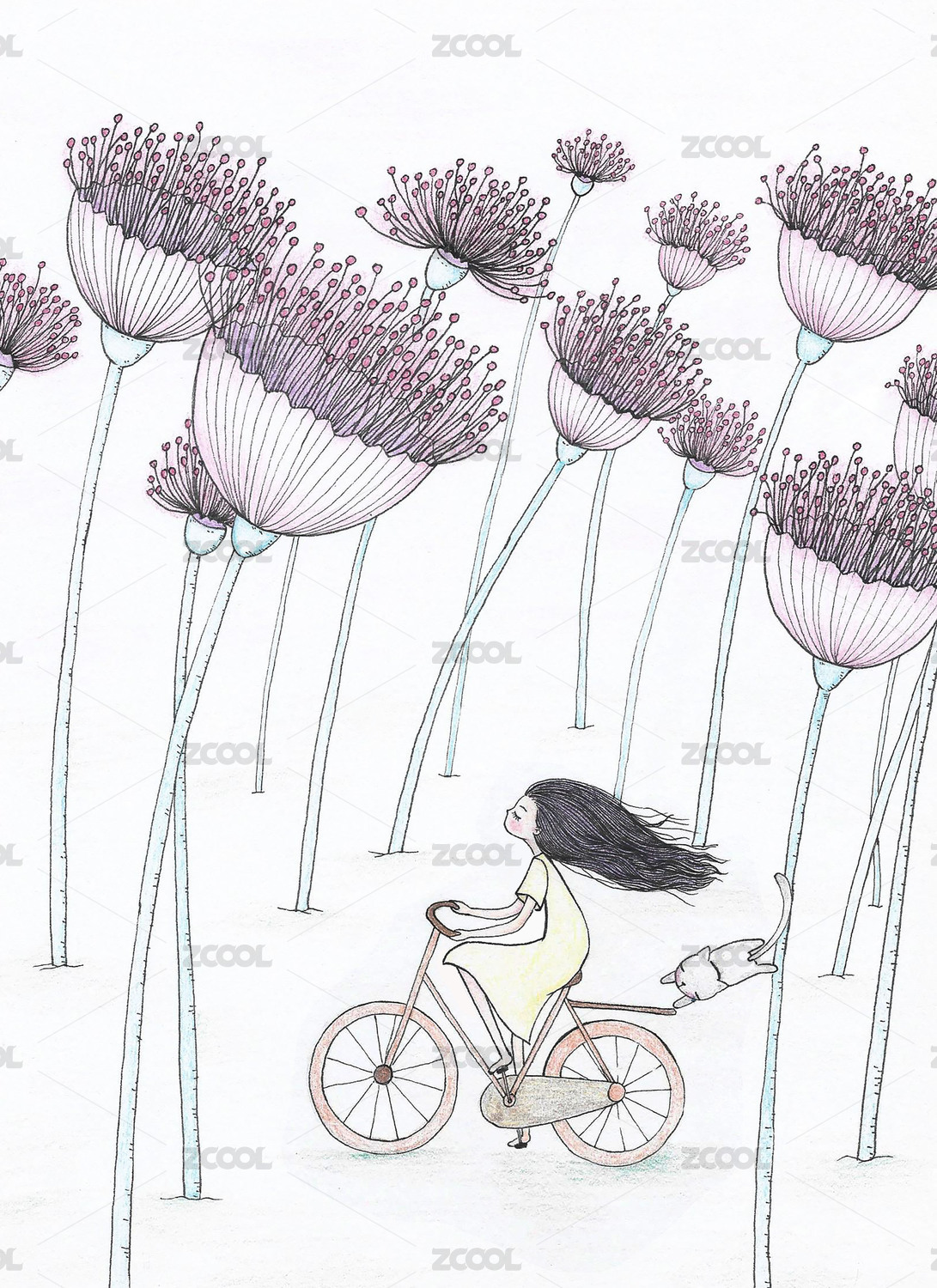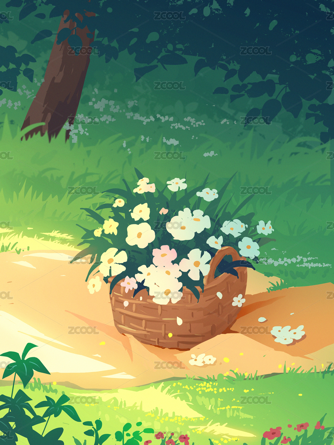 春天立春时节父母带着孩子一起去野外放风筝 手绘插画 竖版