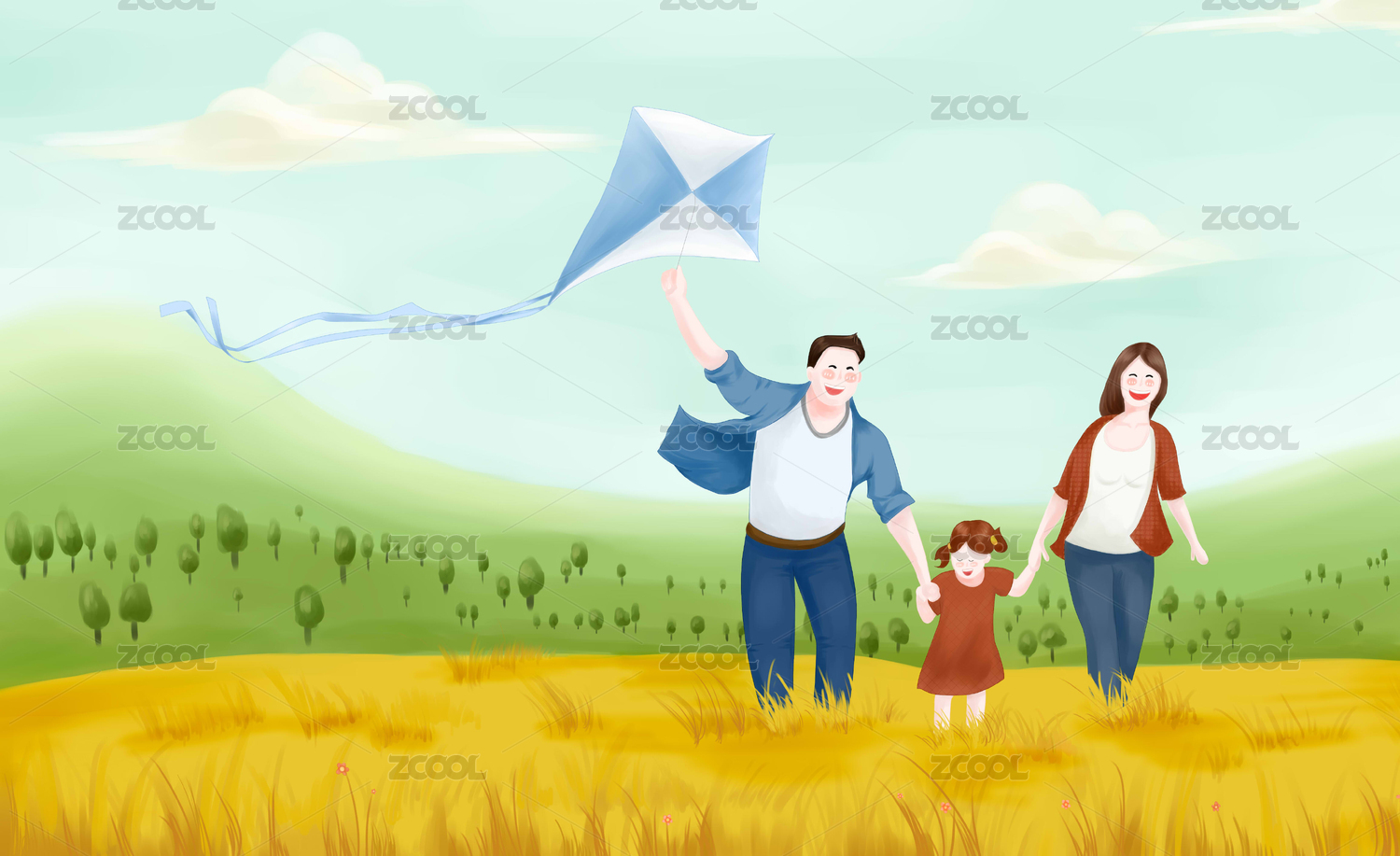 春天立春时节父母带着孩子一起去野外放风筝 手绘插画 横版