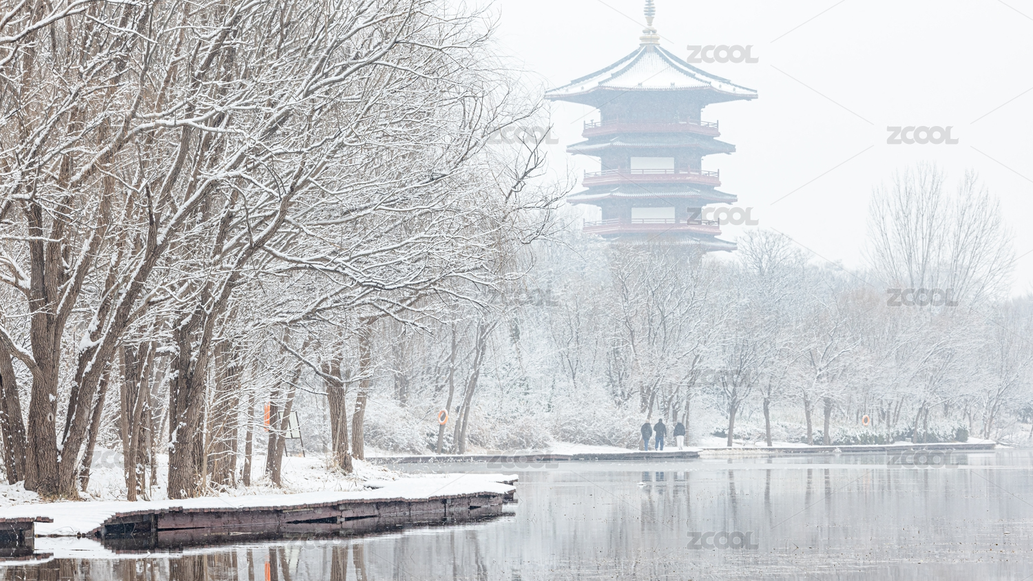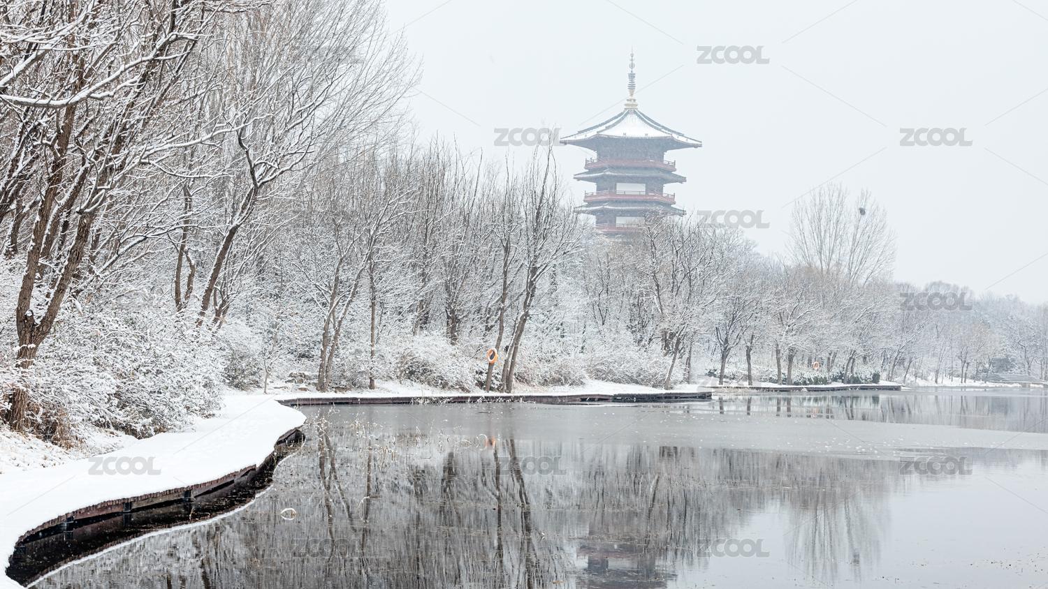 山东潍坊白浪绿洲湿地公园冬季湖泊雪景