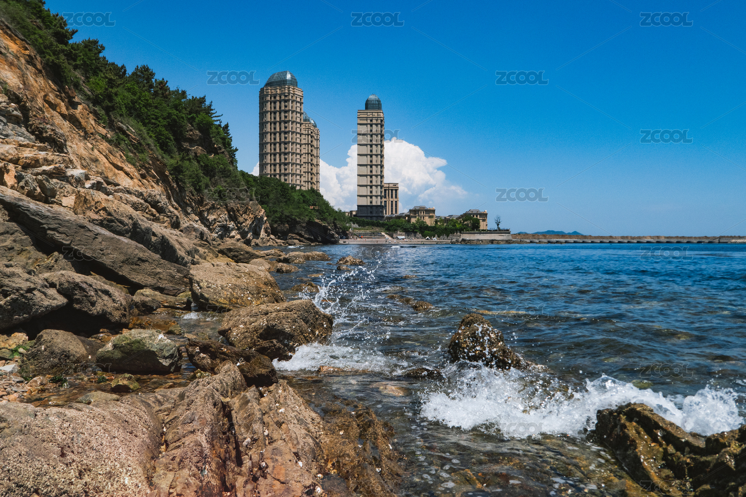 大连七贤岭公园海景,蓝天白云下风吹浪起