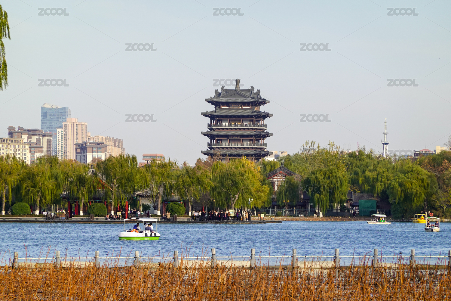 中国济南芦苇与秋水对岸的层楼宝塔