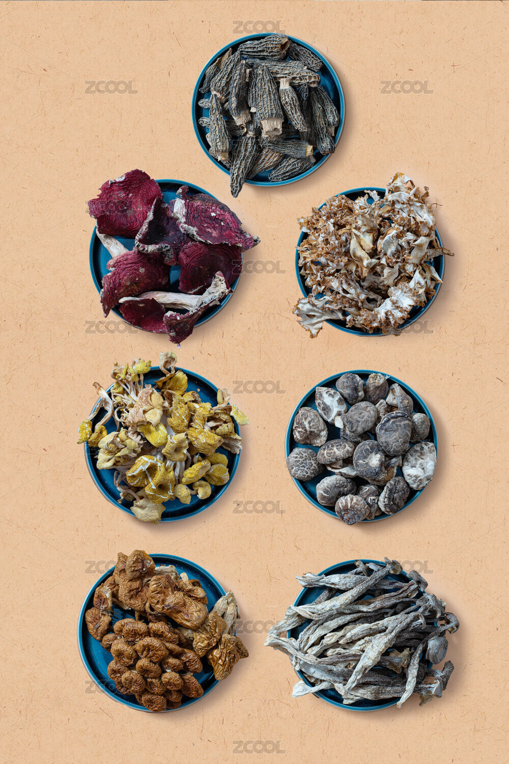 白色桌面上有一些蘑菇排列