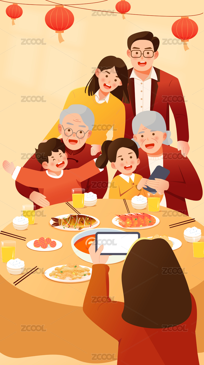手绘火锅团圆饭聚餐饭桌吃货节矢量剪纸插画