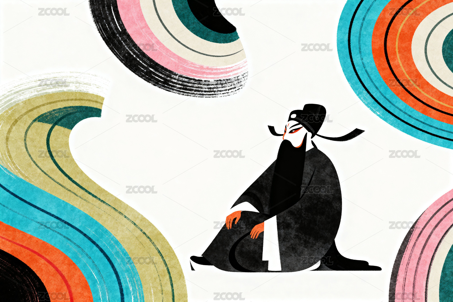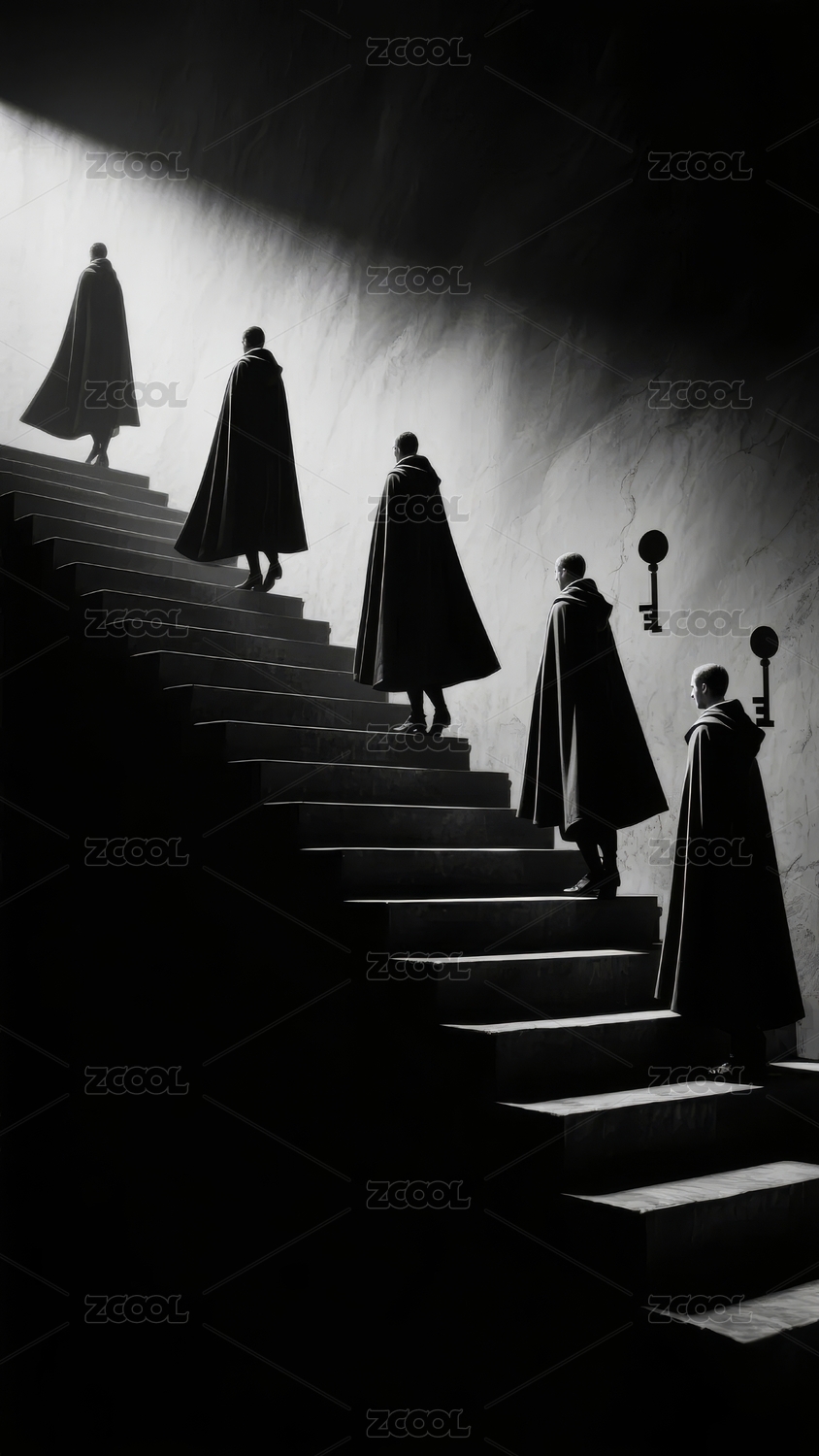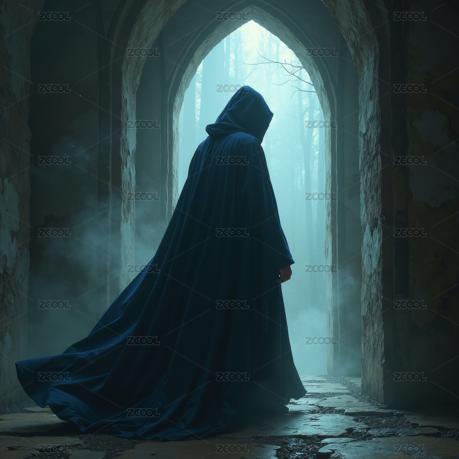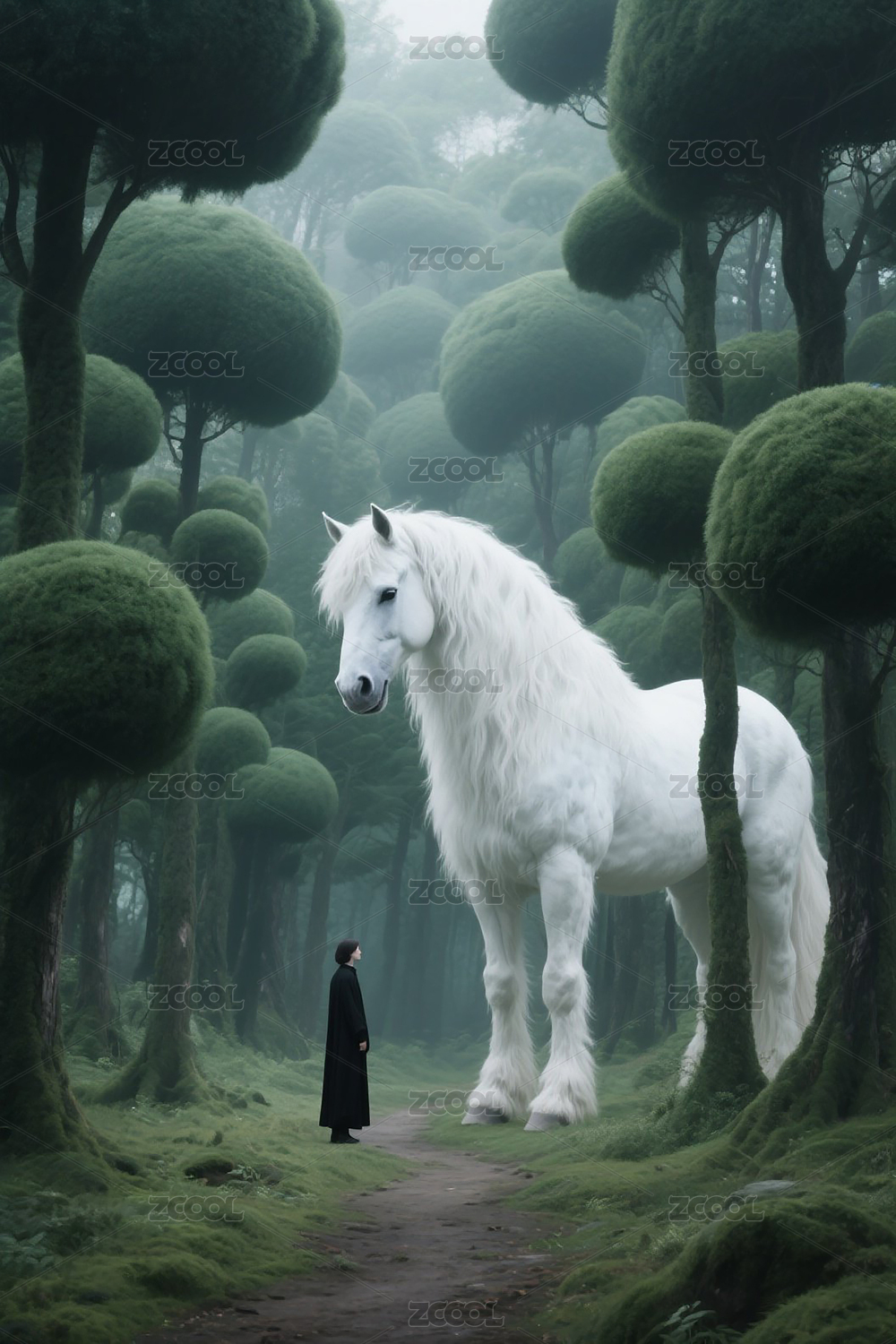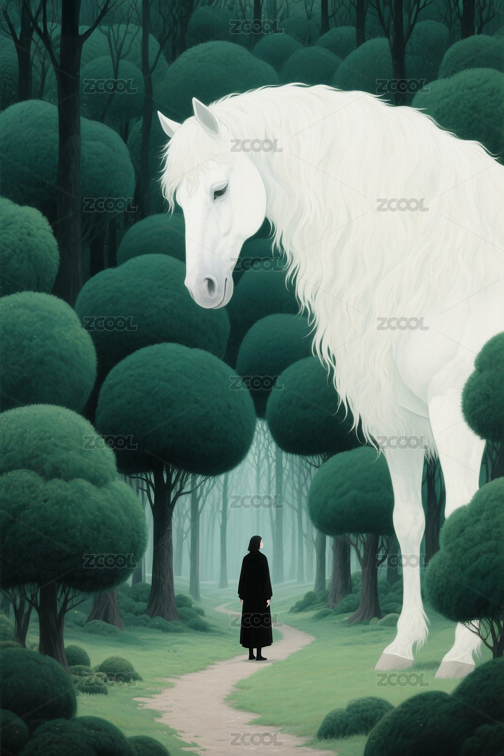 雾森巨马与黑袍人神秘邂逅奇幻插画