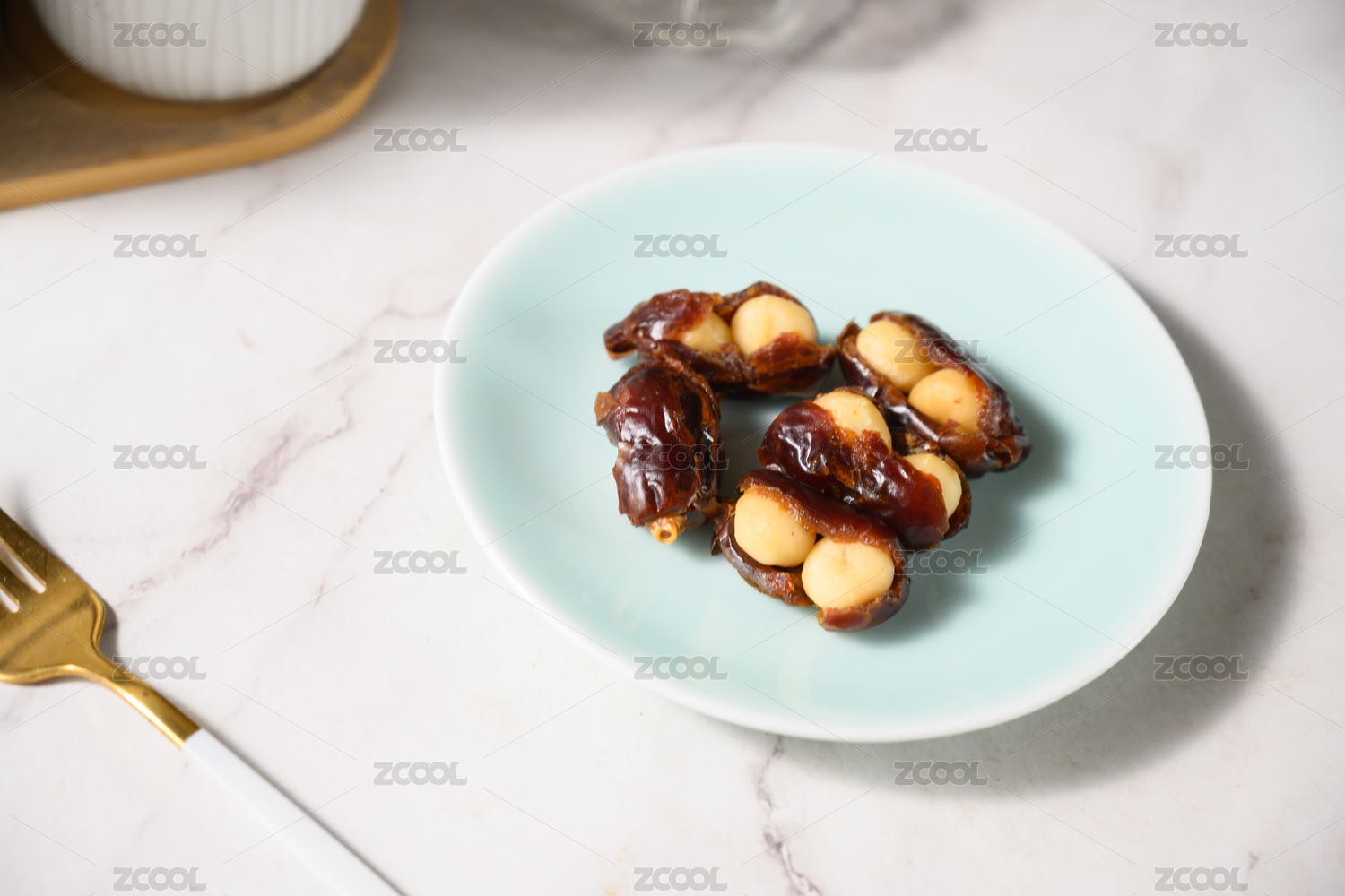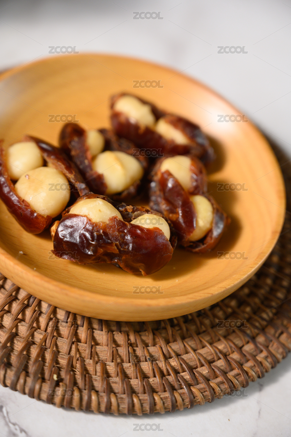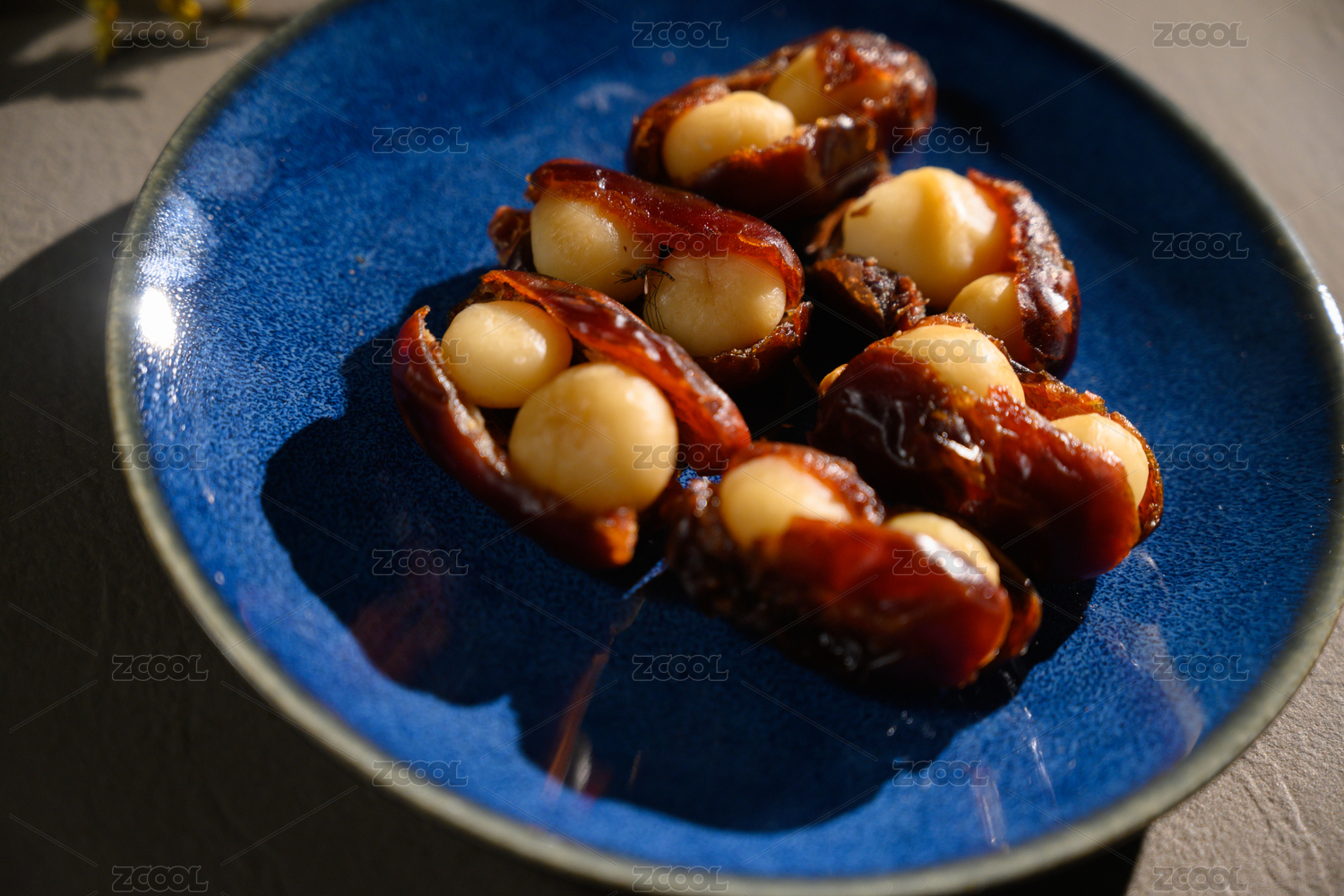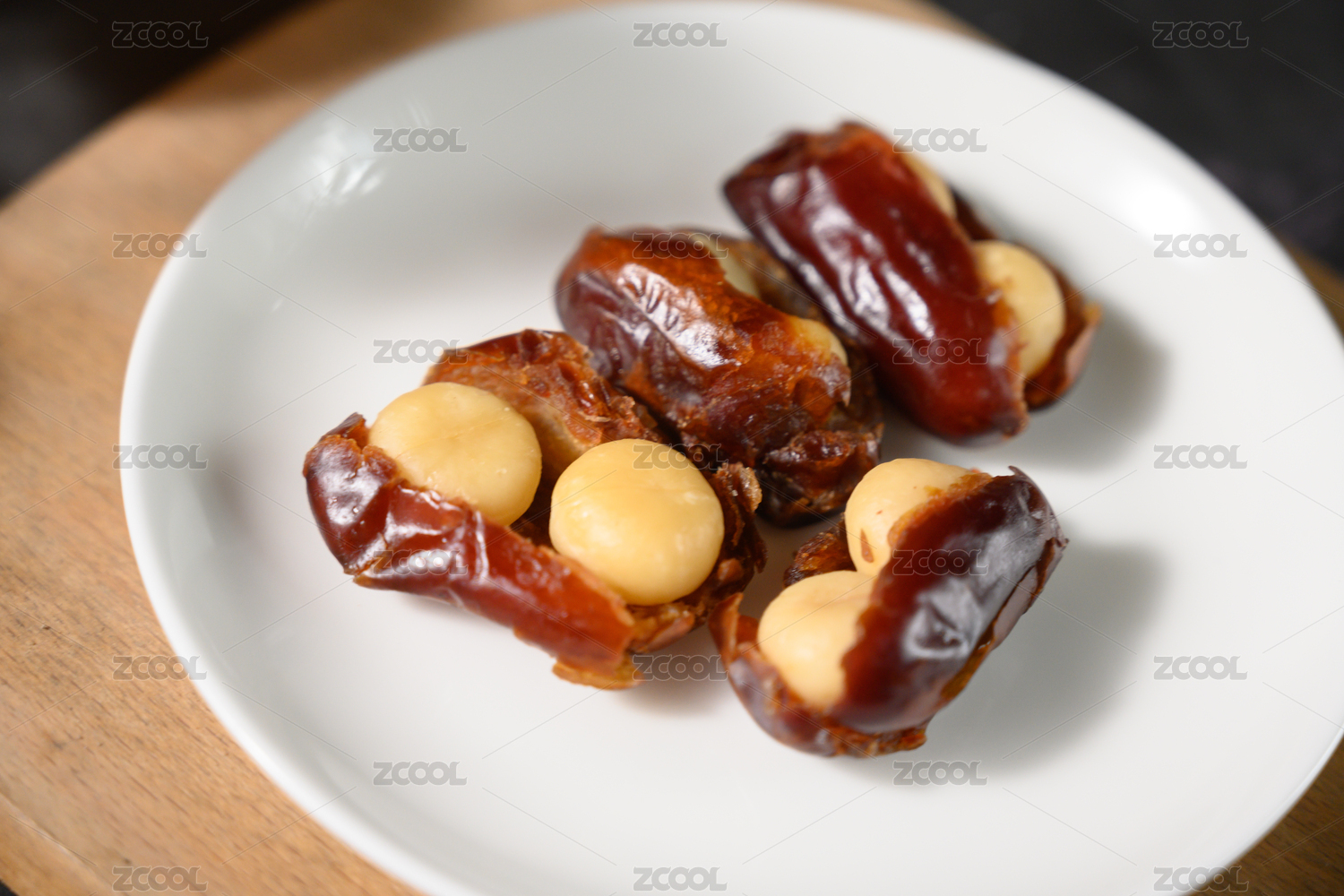 桌面上的盘子里的美味可口的椰枣夏威夷果仁