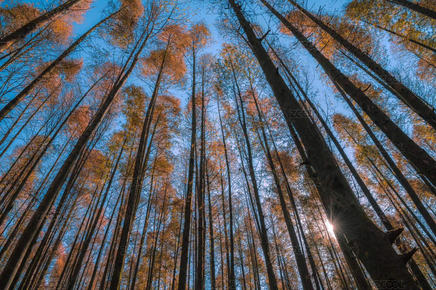 俄罗斯高加索山脉密集直立的杉树林秋天