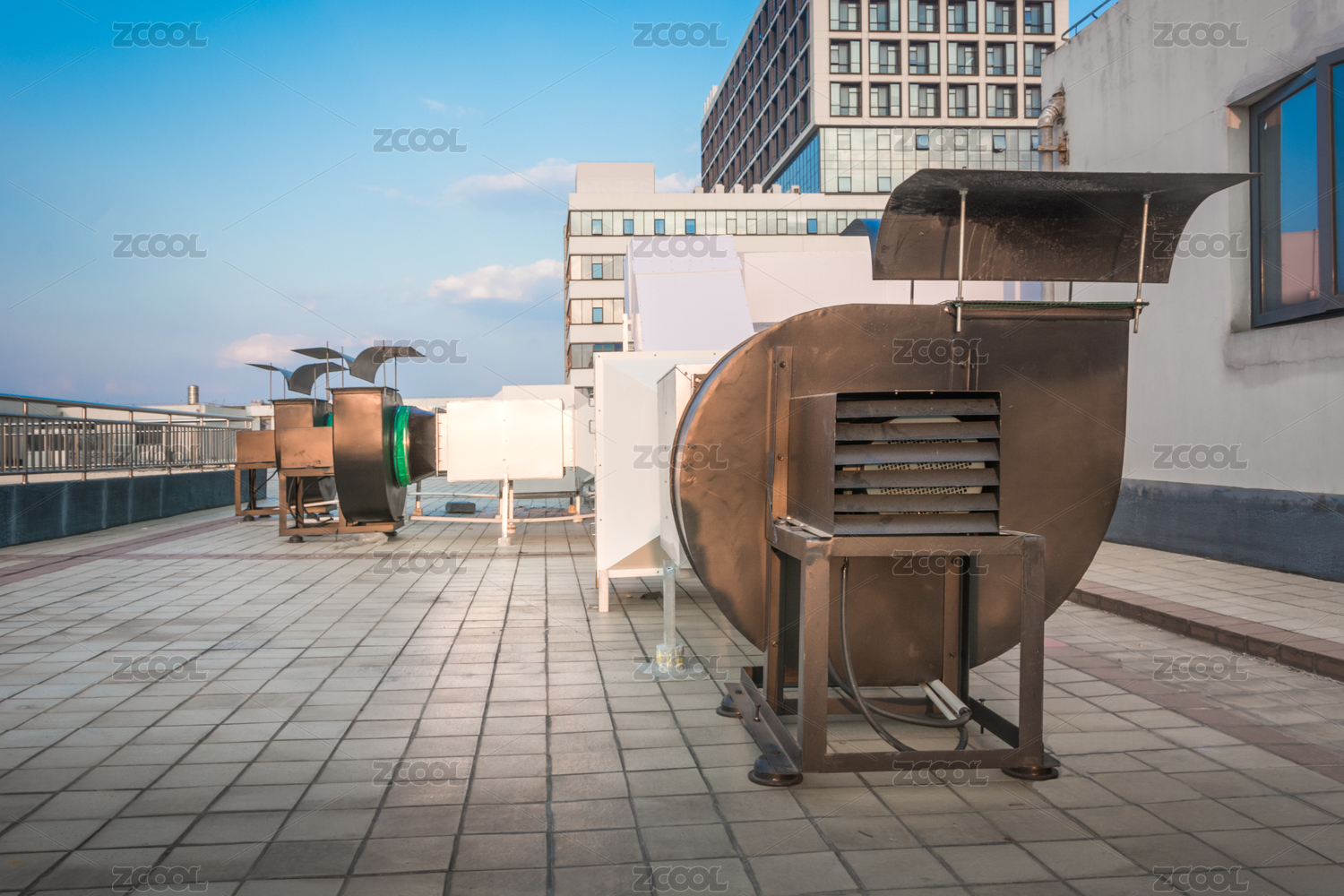 建筑天台上使用白铁制作的通风管道设施