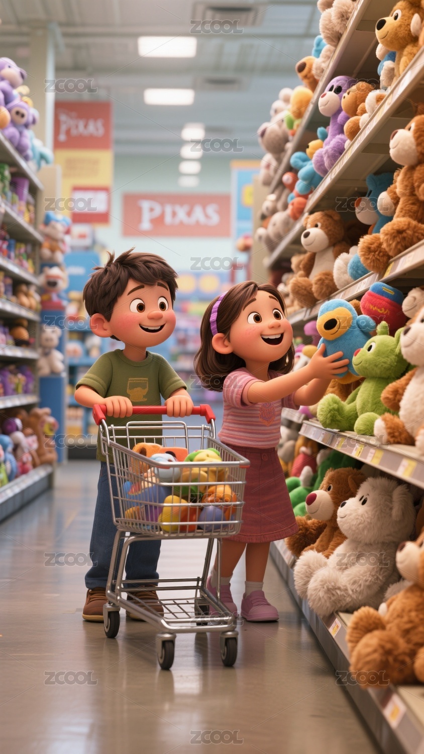 卡通风格儿童购物场景插画