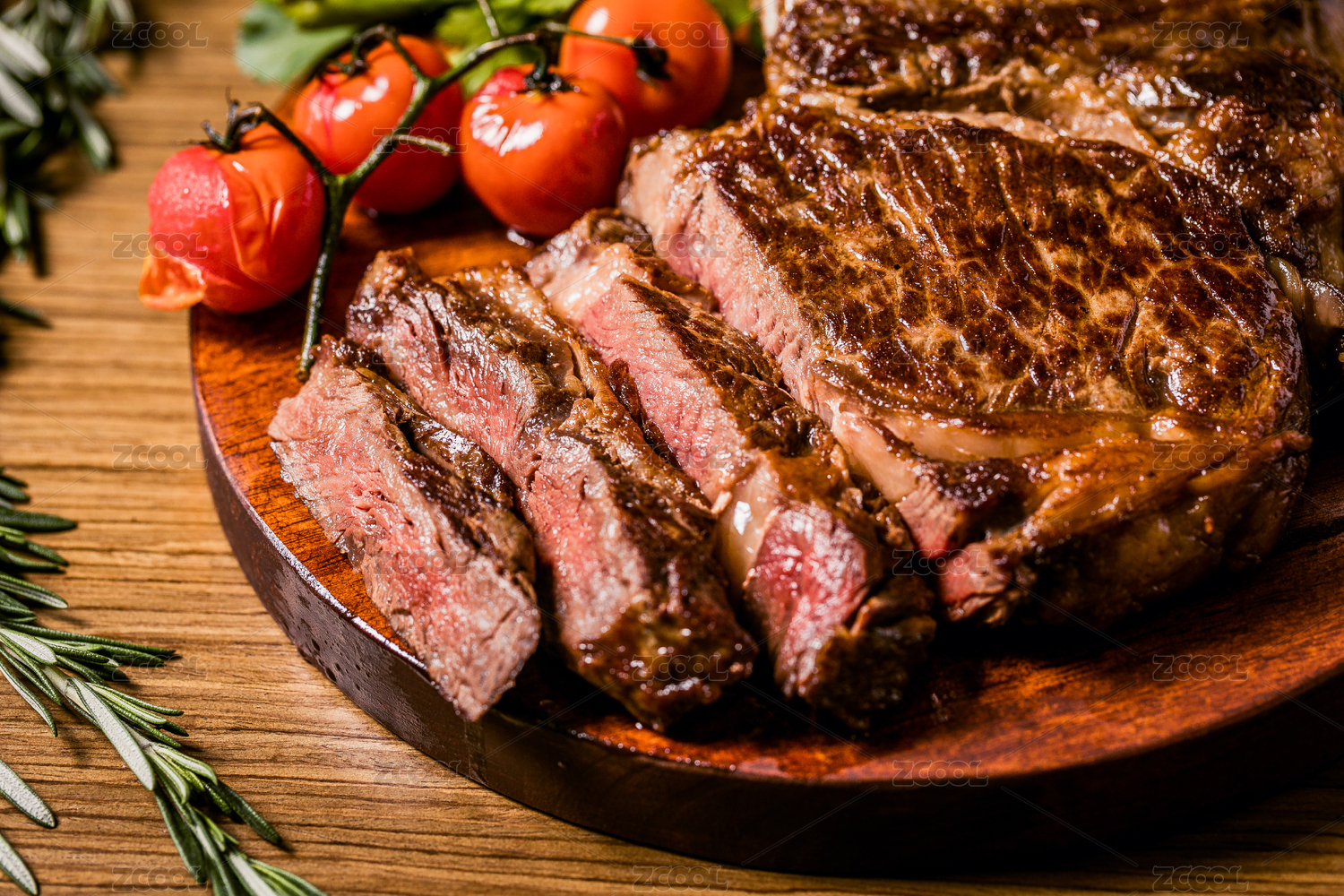 木头砧板上切开的牛排和烤好的西红柿