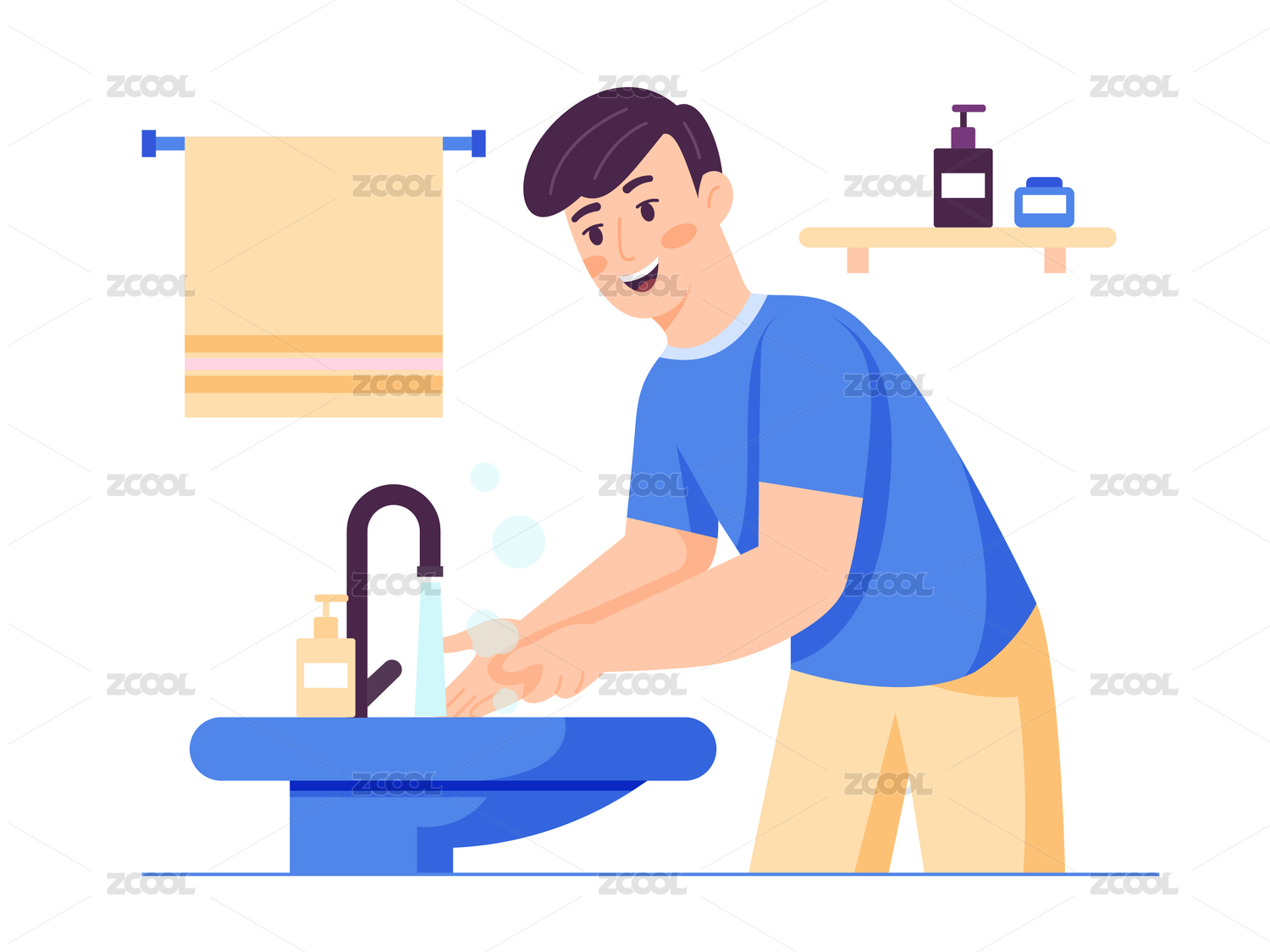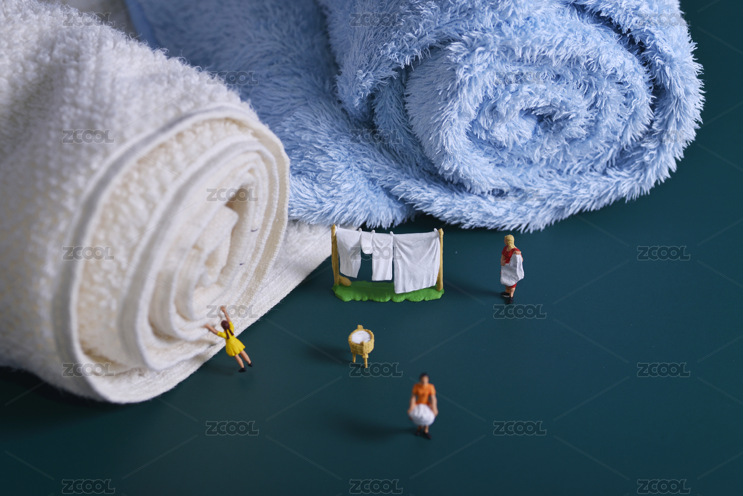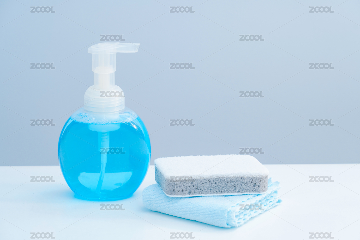 蓝色背景前挂着条纹毛巾,旁边还一瓶洗手液