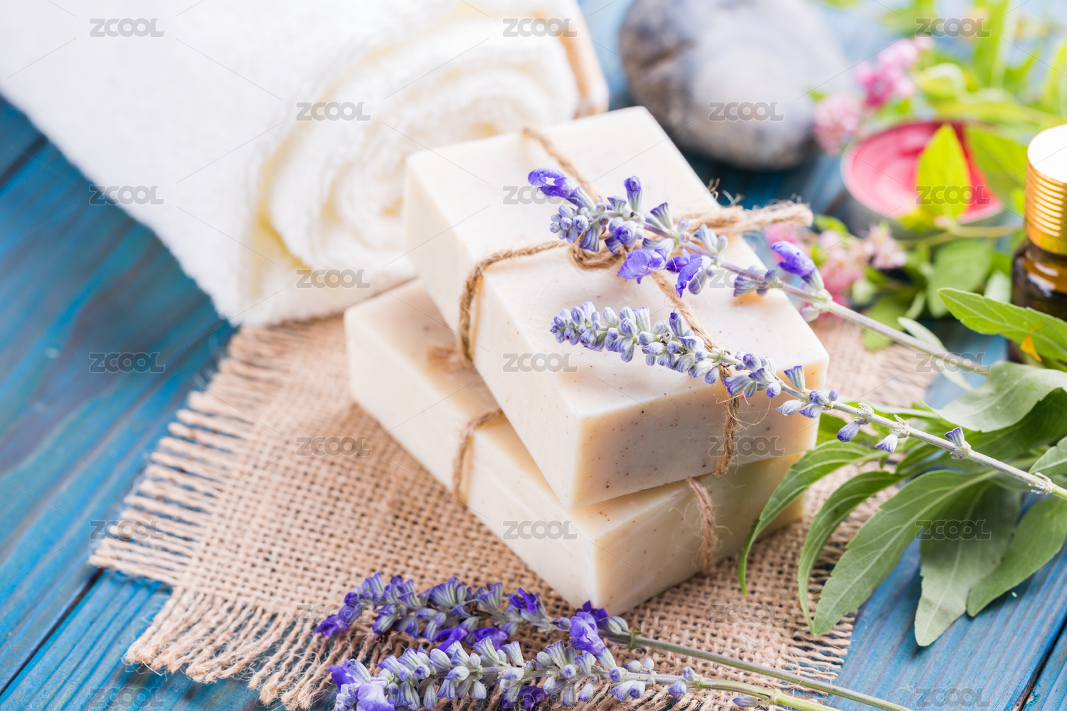 手工皂,新鲜的植物和精油以及手工制作的香皂在蓝色的桌子上