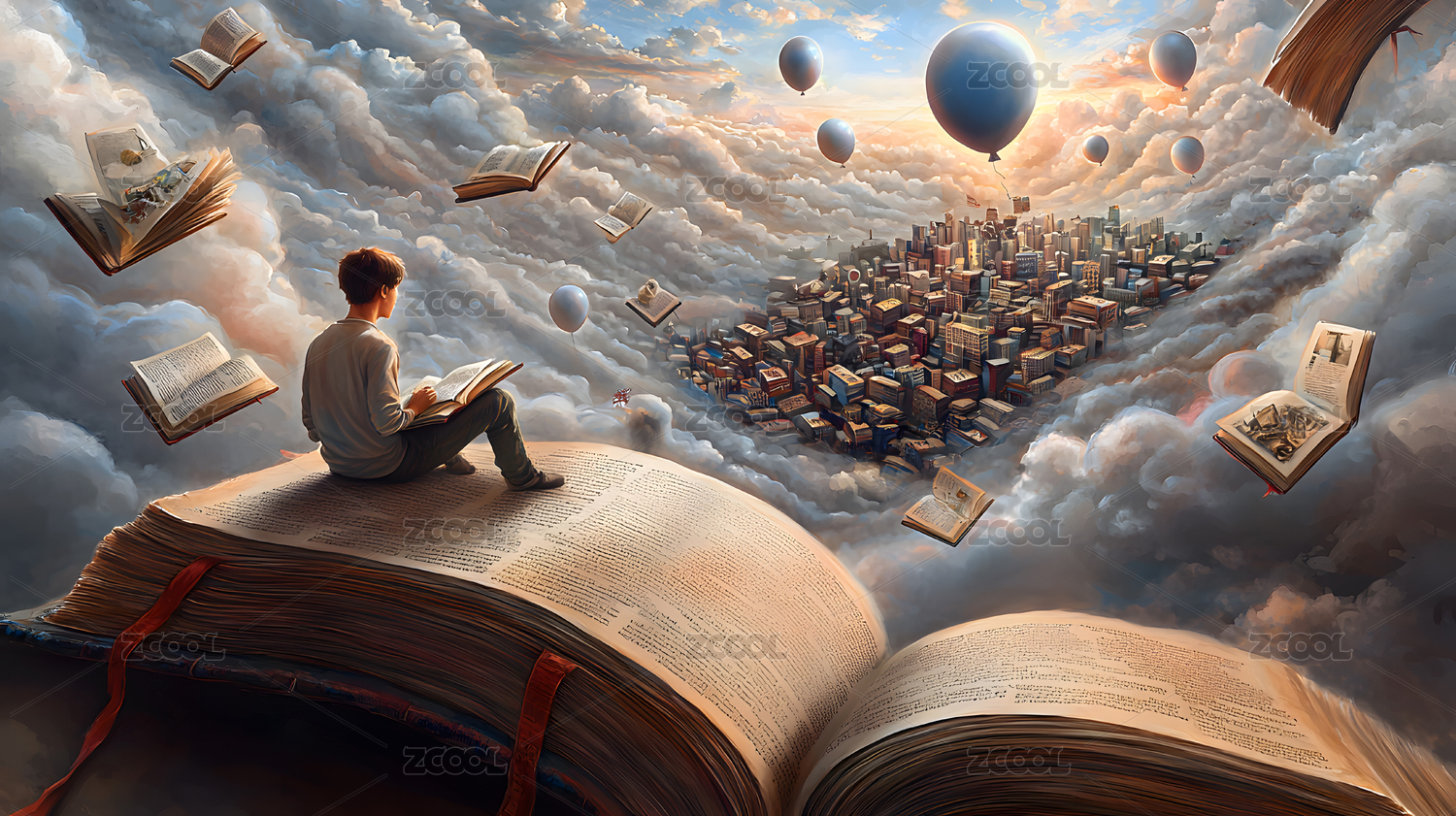 一个男孩在漂浮书籍中阅读一本巨书