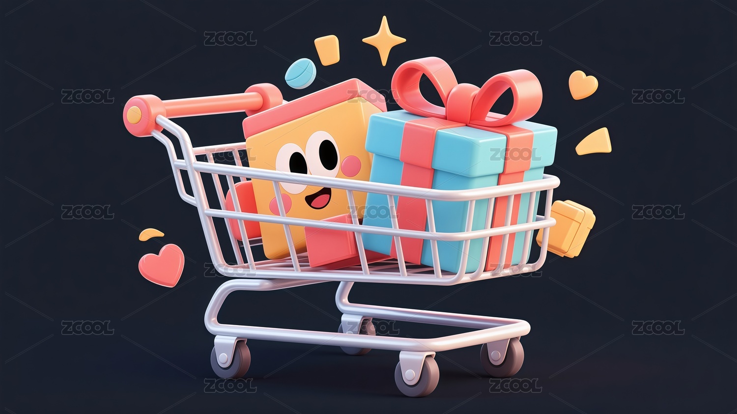 3D卡通风格购物车与礼盒场景插画