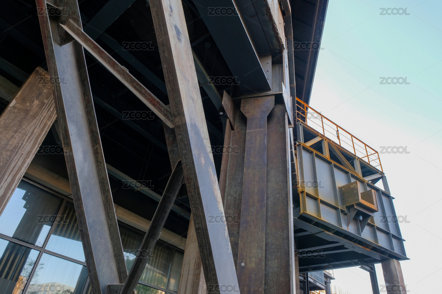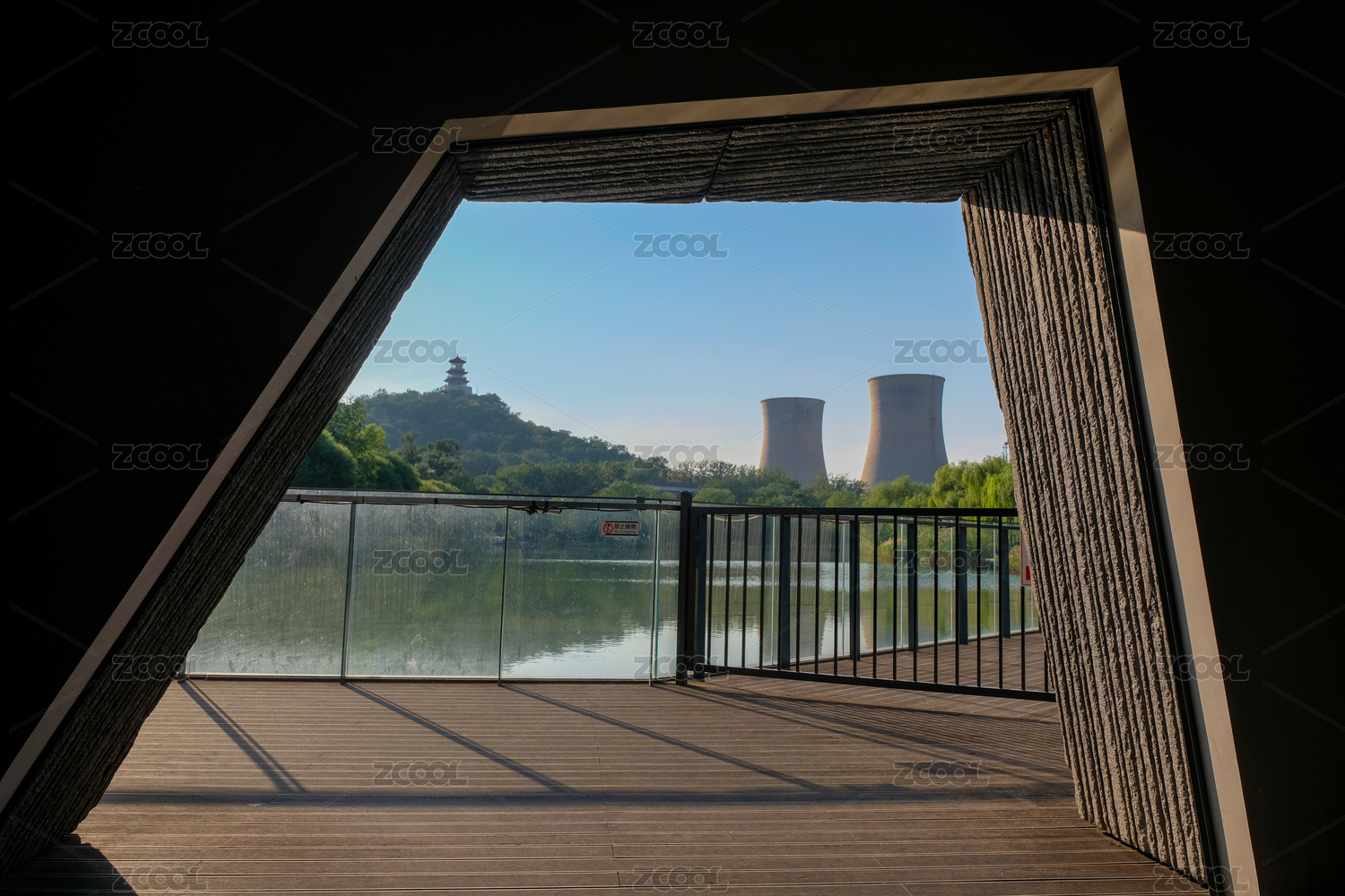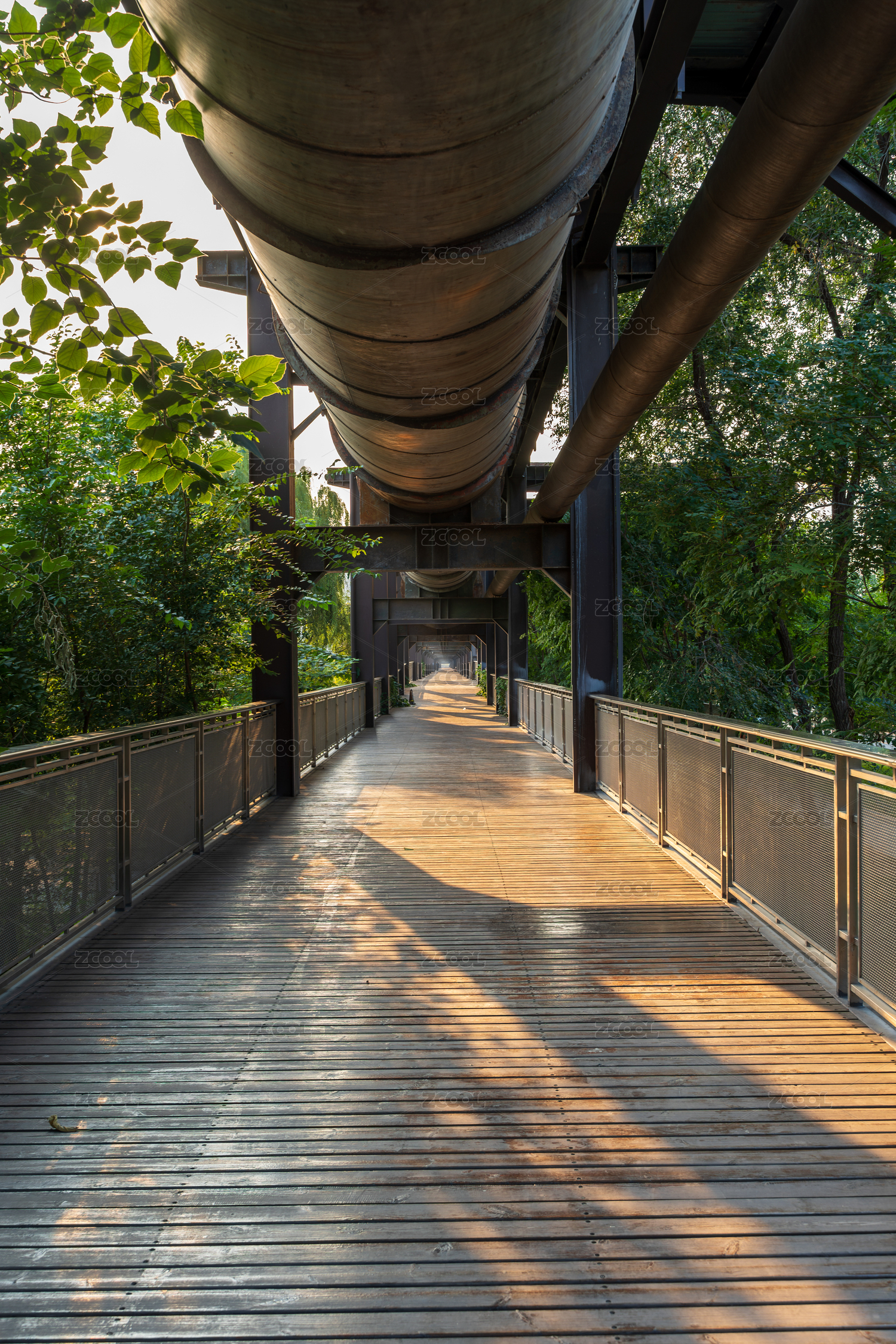 北京首钢园林间阳光斑驳的工业风木质栈道
