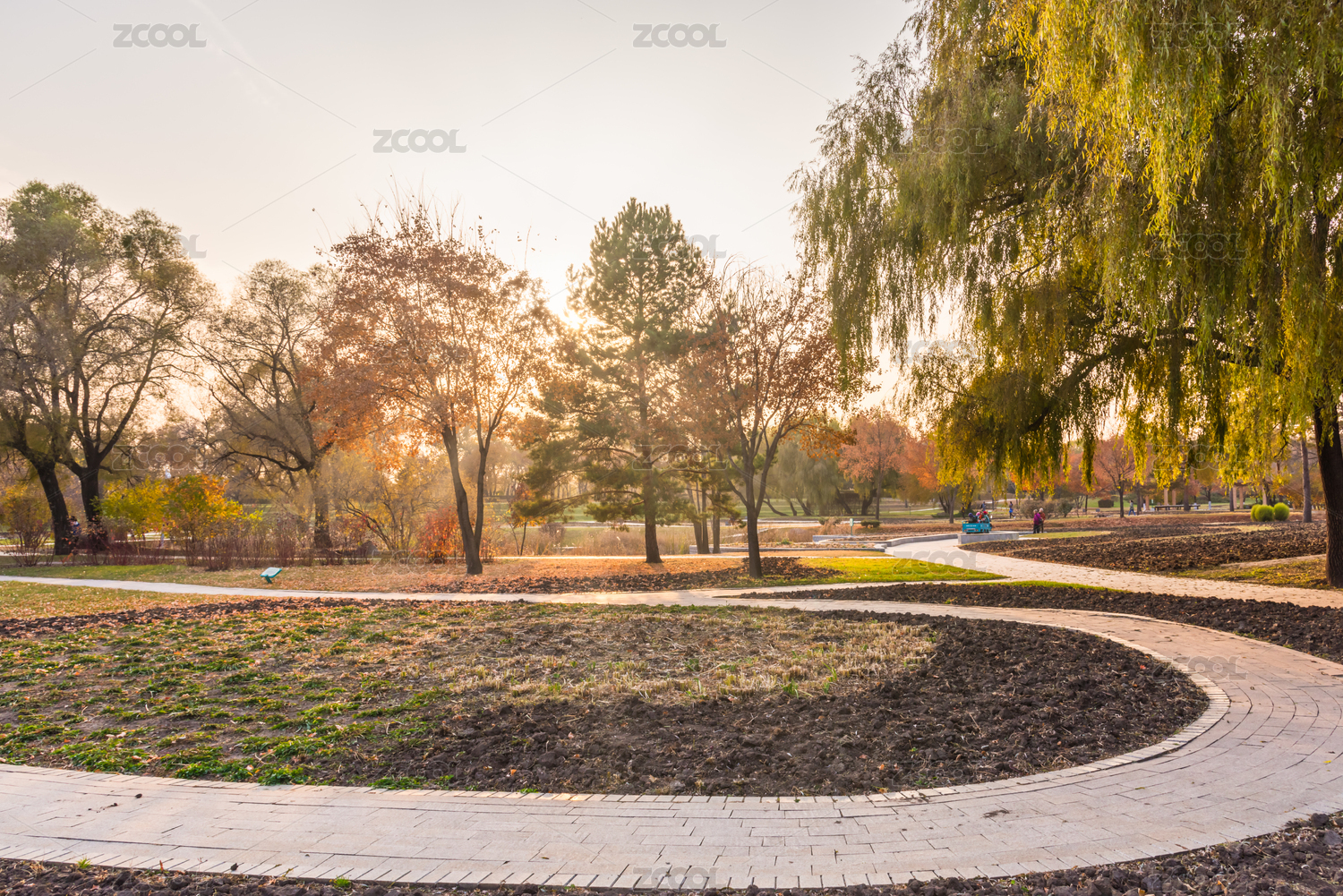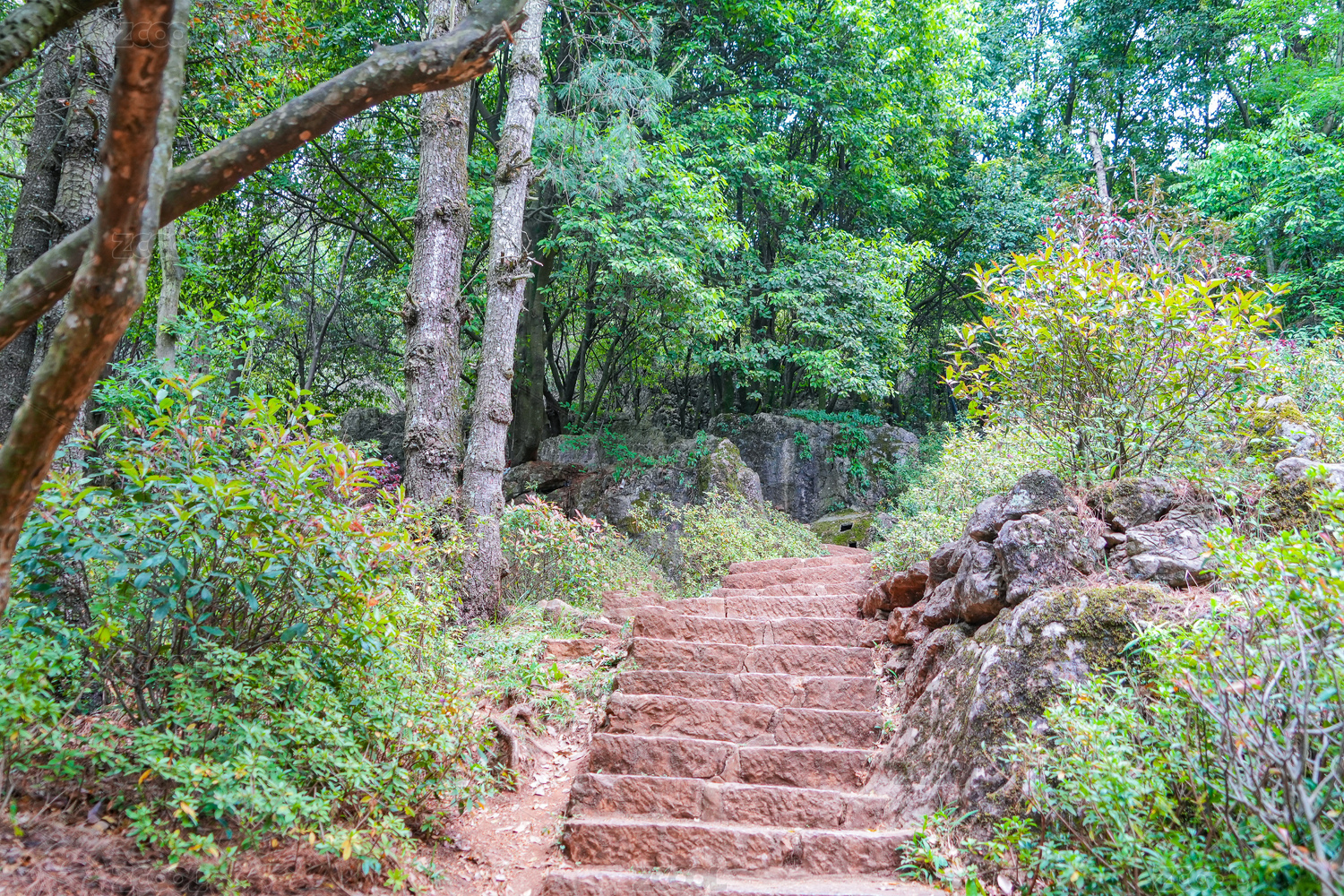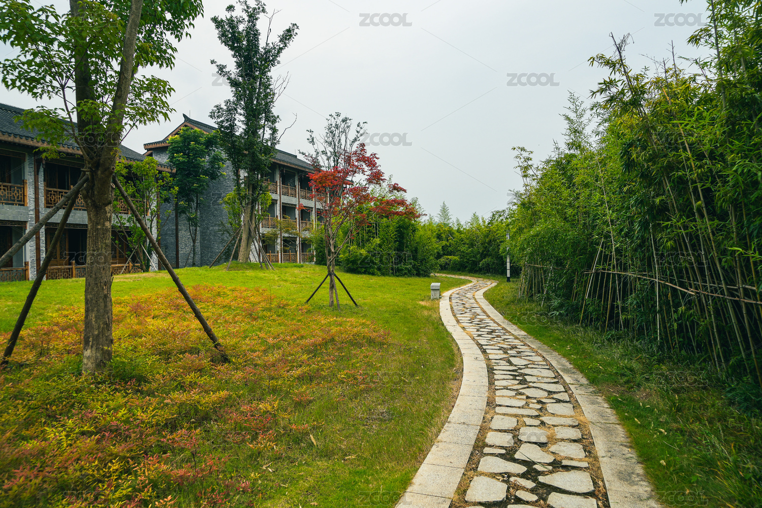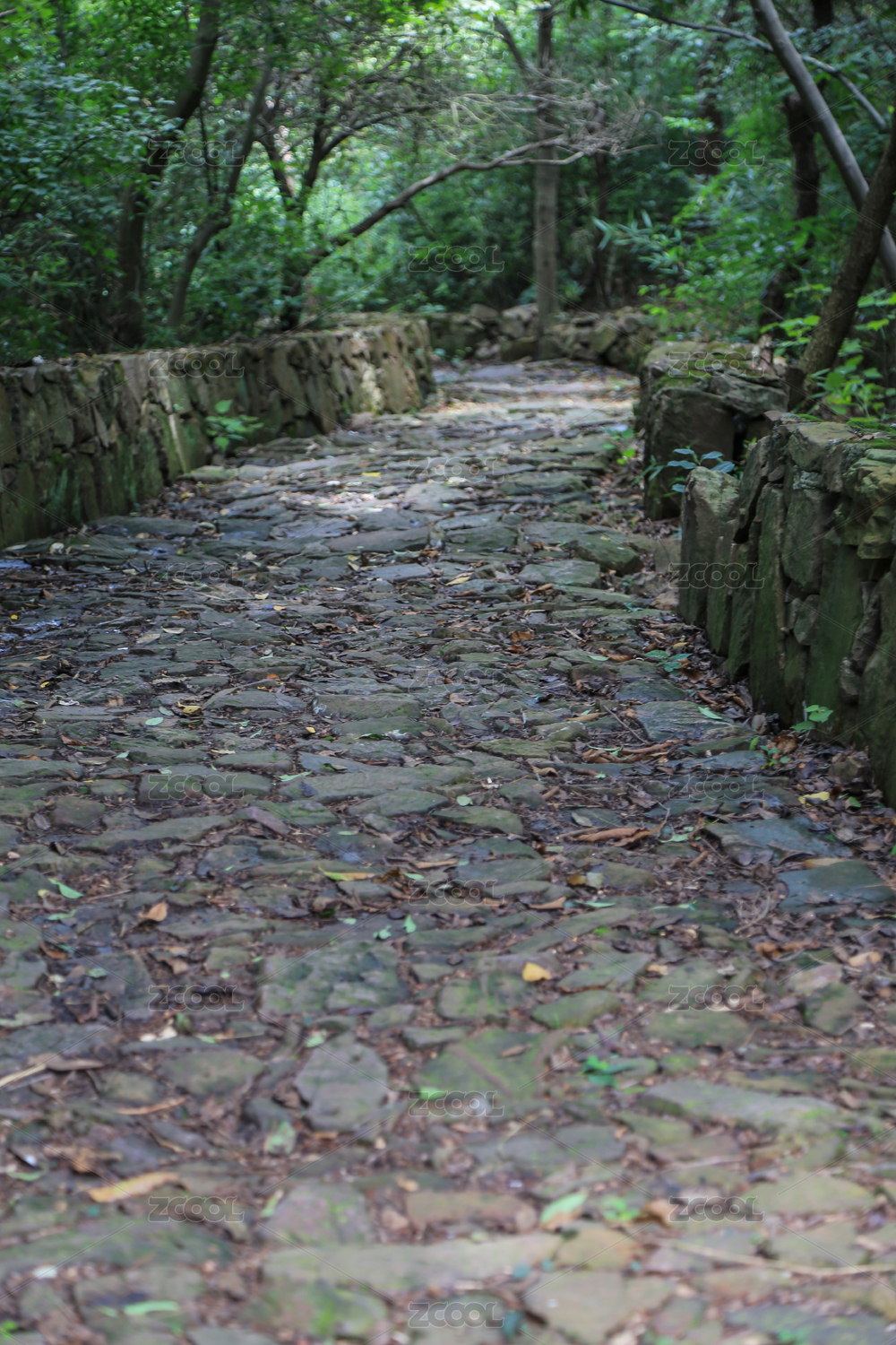 绿树成荫的园林里一条石板路通向远方