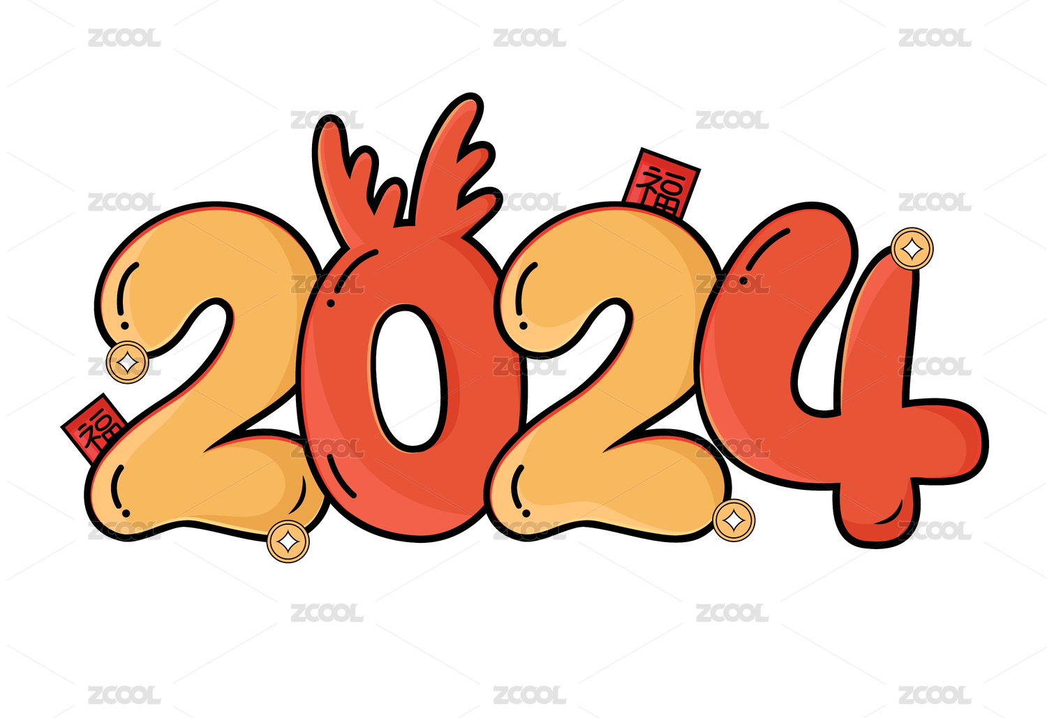 2024龙过新年数字彩色标题金币红包素材