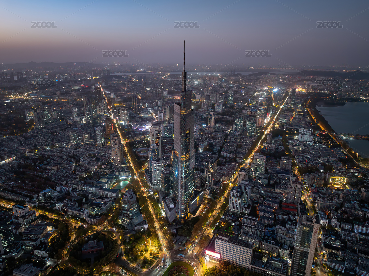 江苏南京CBD紫峰大厦建筑群日落夜景航拍