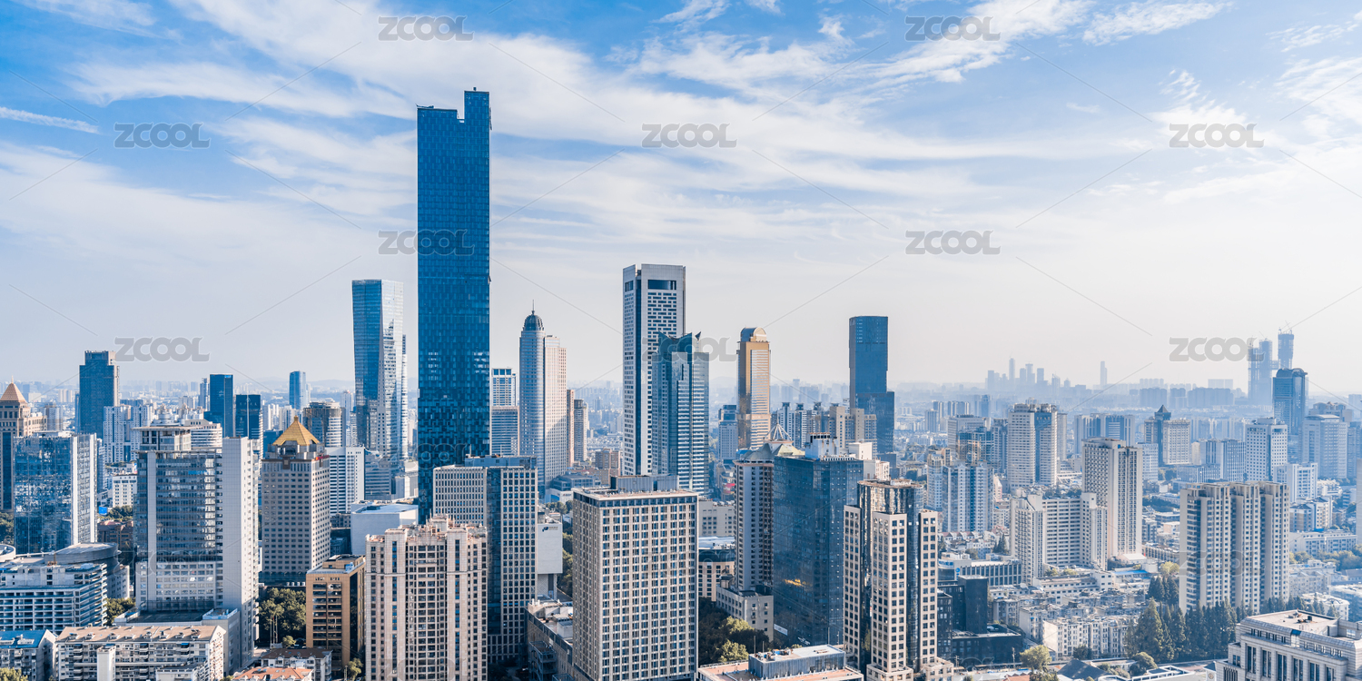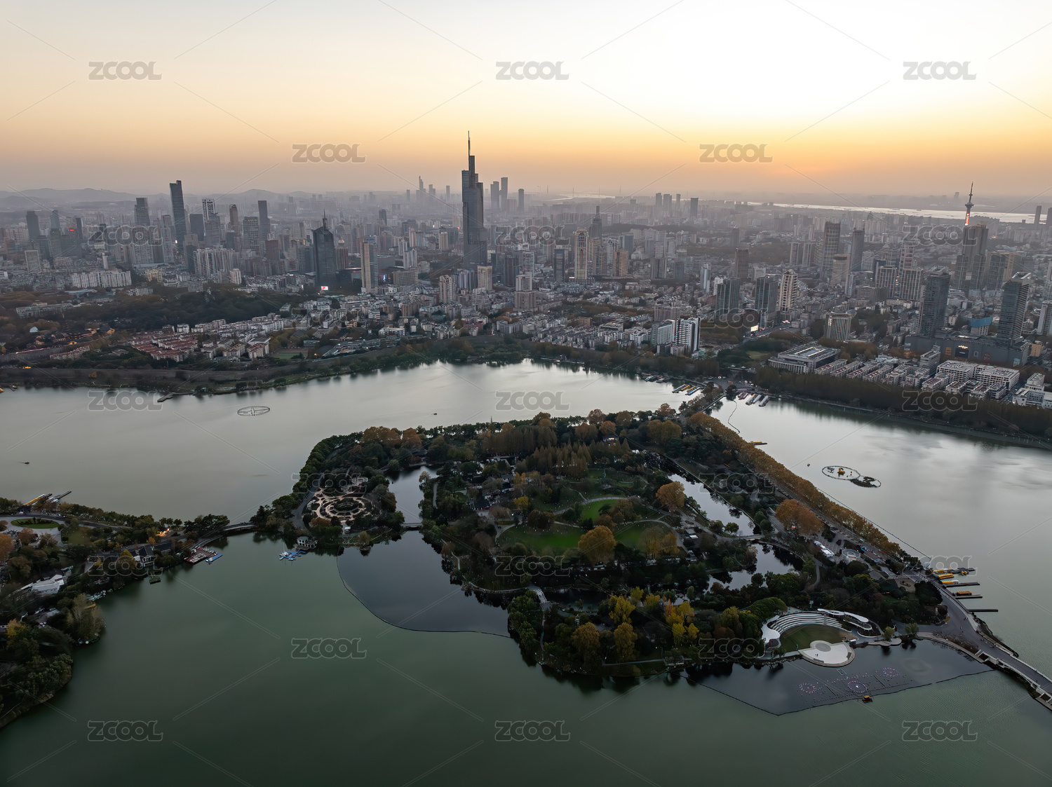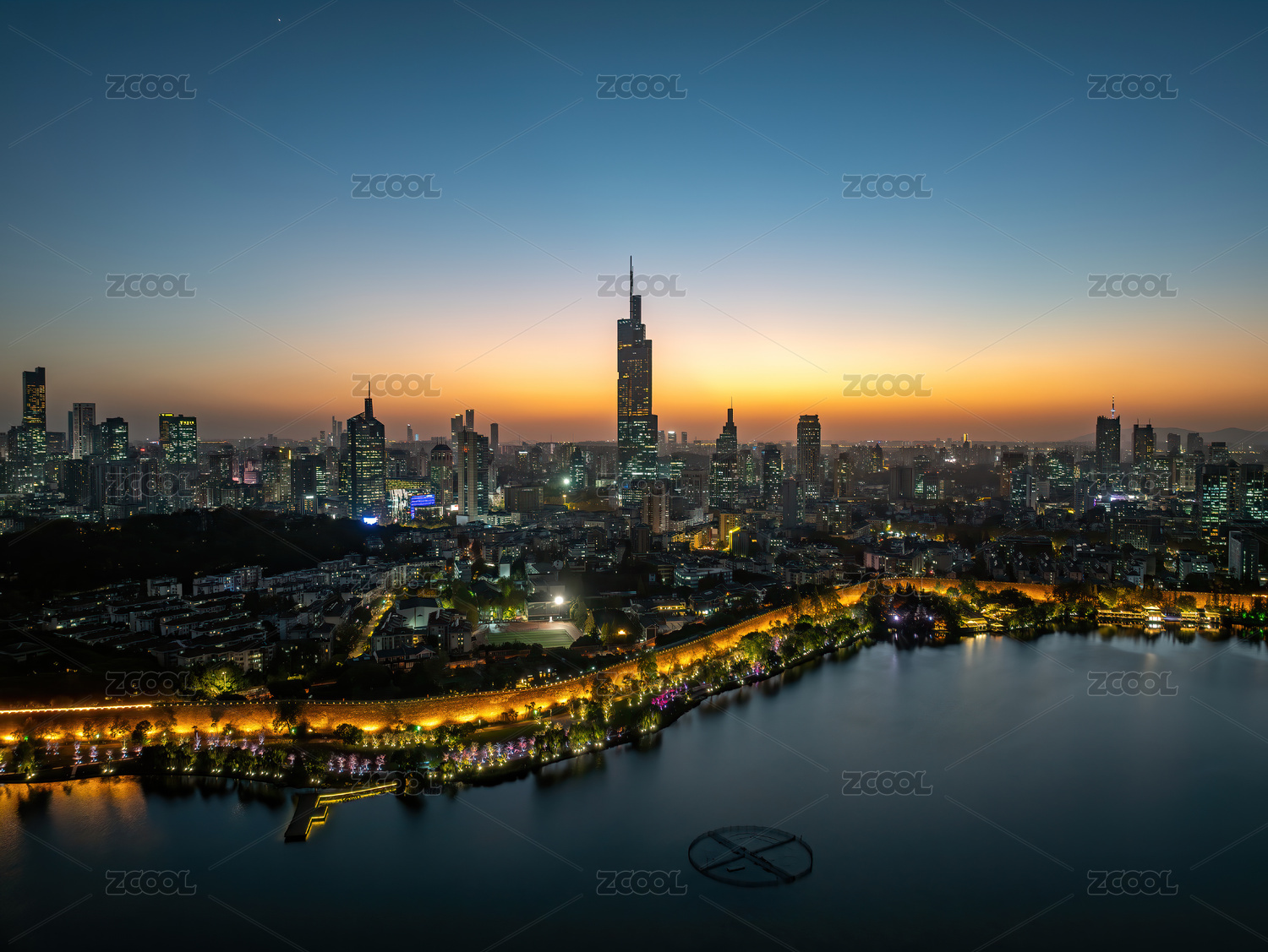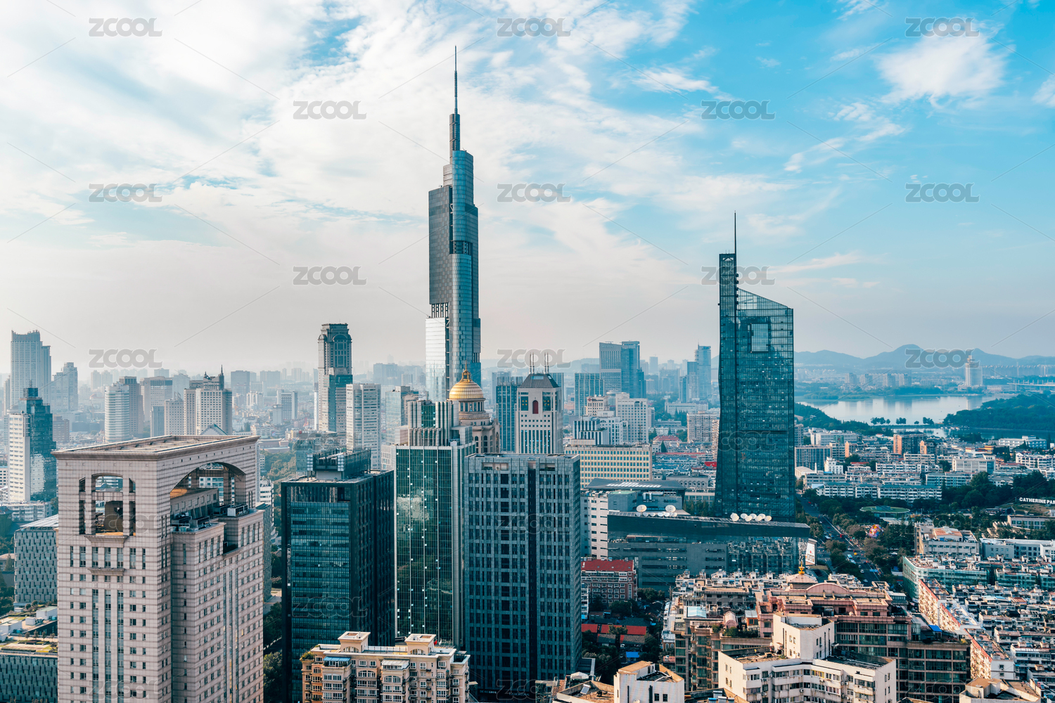 中国南京紫峰大厦、玄武湖城市天际线建筑群