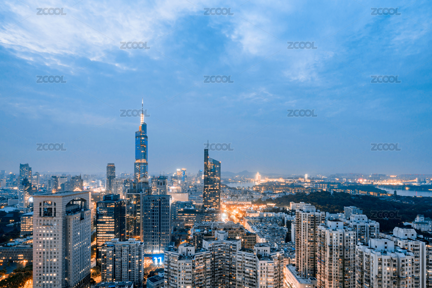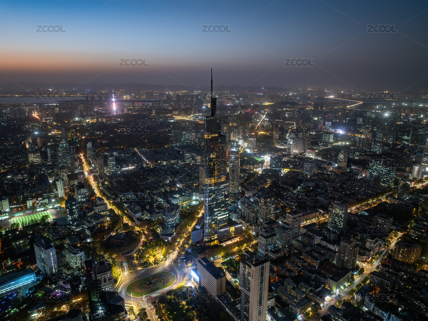 中国南京紫峰大厦、城市天际线建筑群夜景