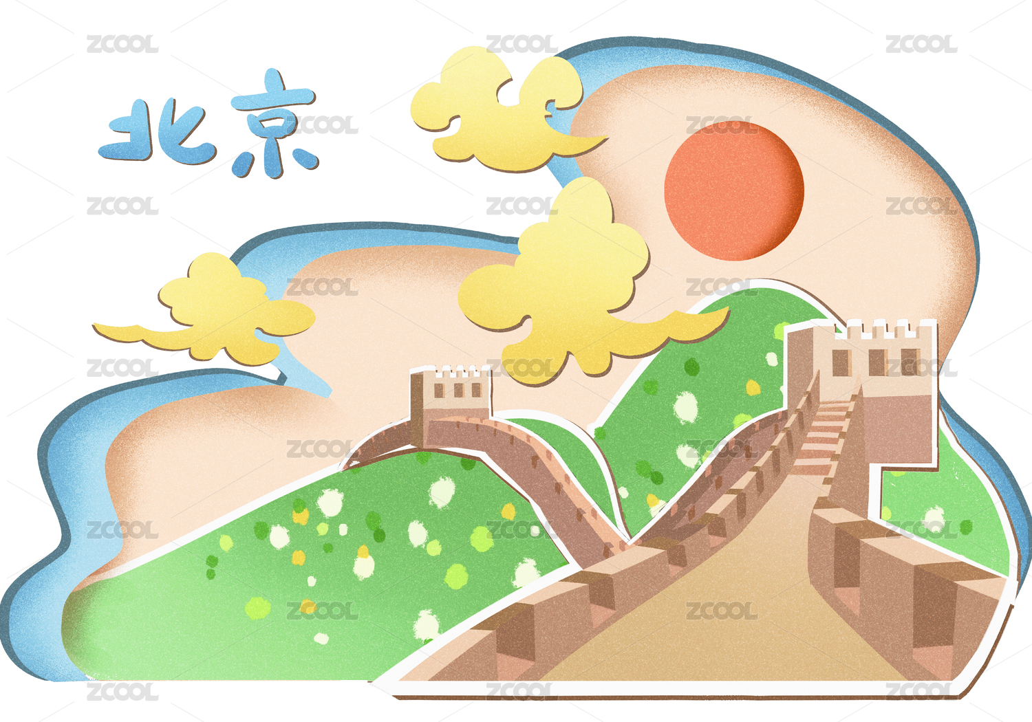 剪纸风格中国北京地标建筑长城插画